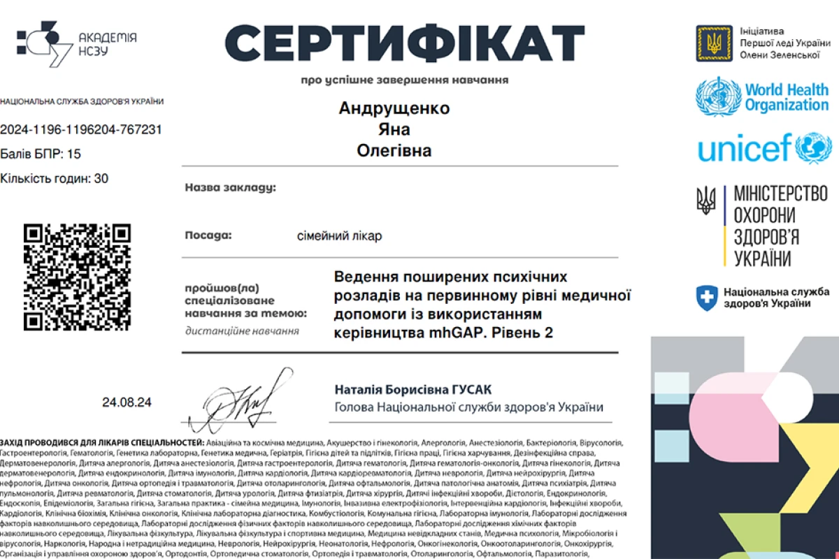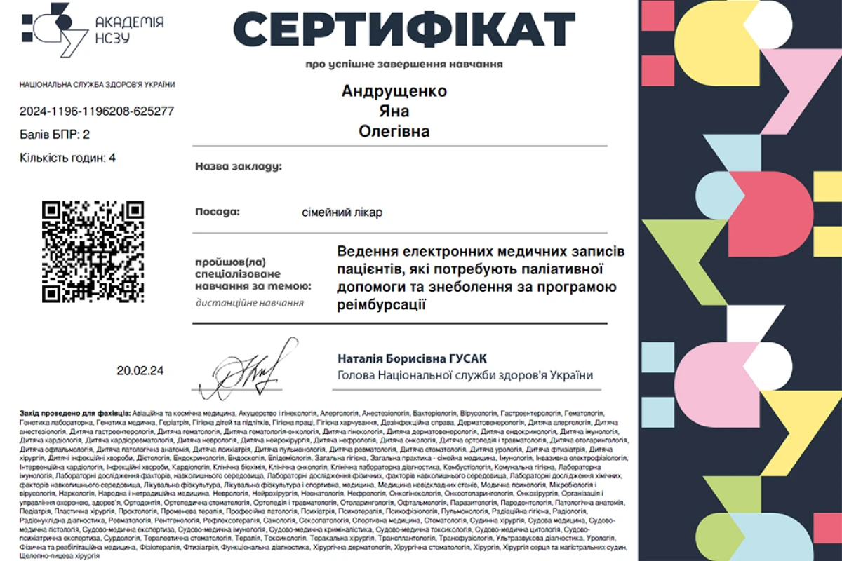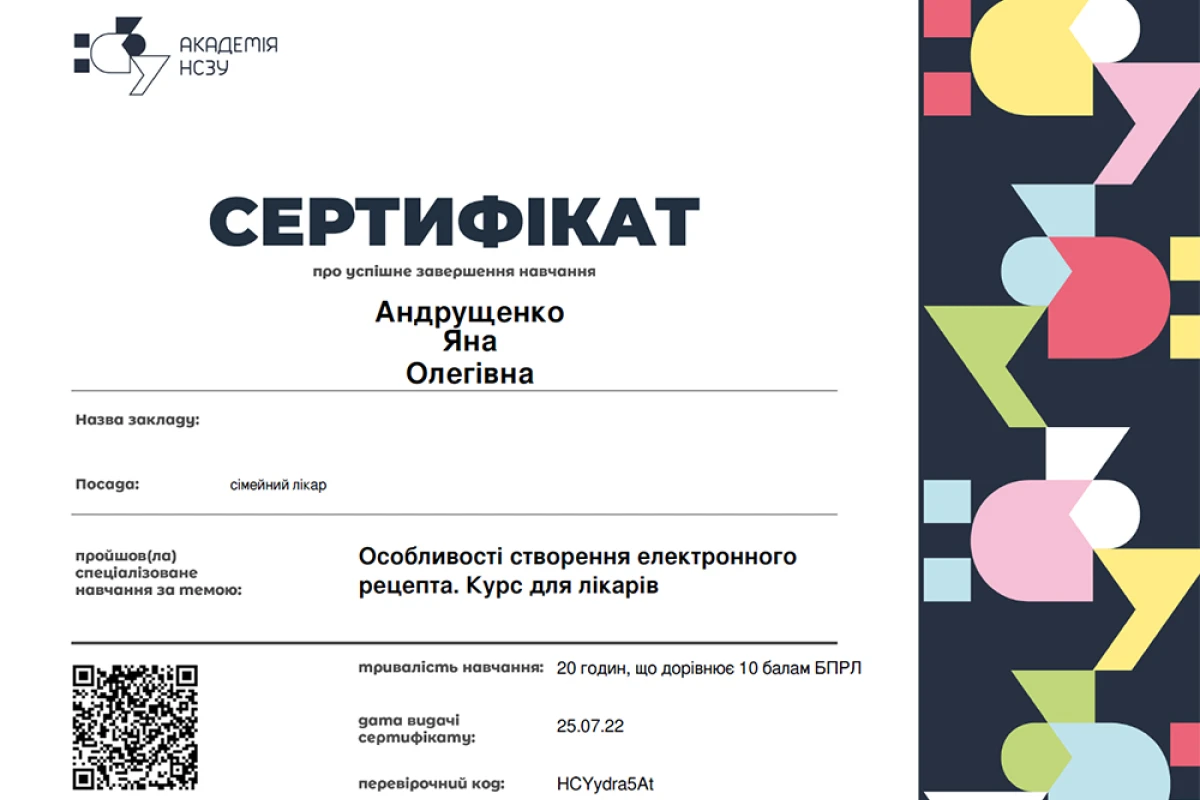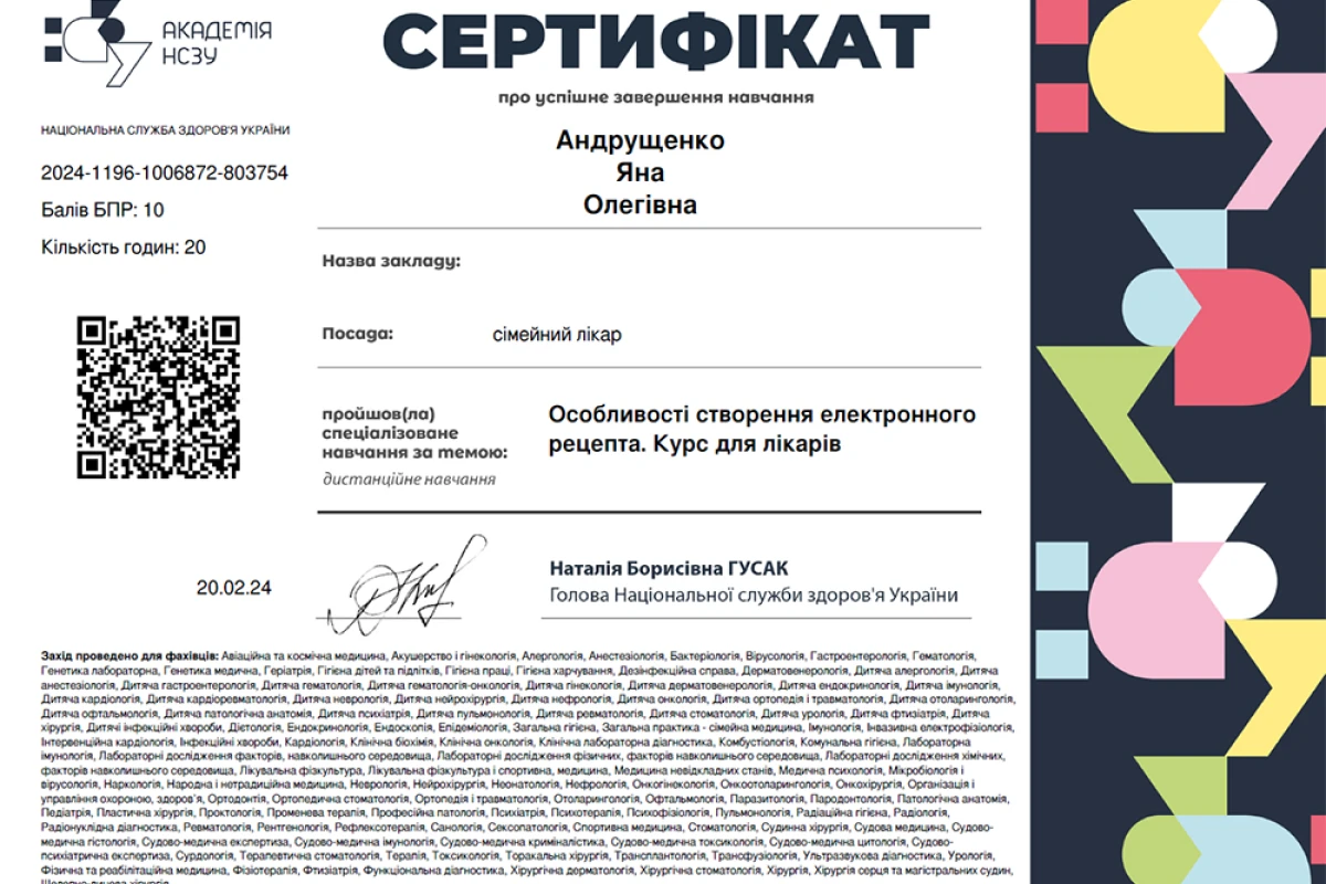 - 2020 – 2022: Национальный университет здравоохранения Украины имени П.Л. Шупика. Общая практика – семейная медицина.