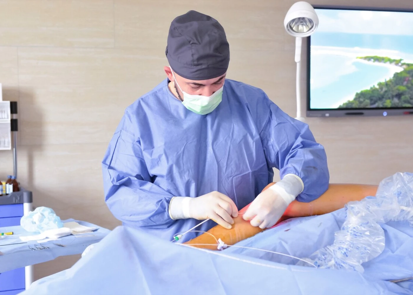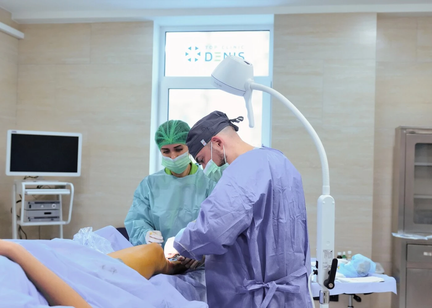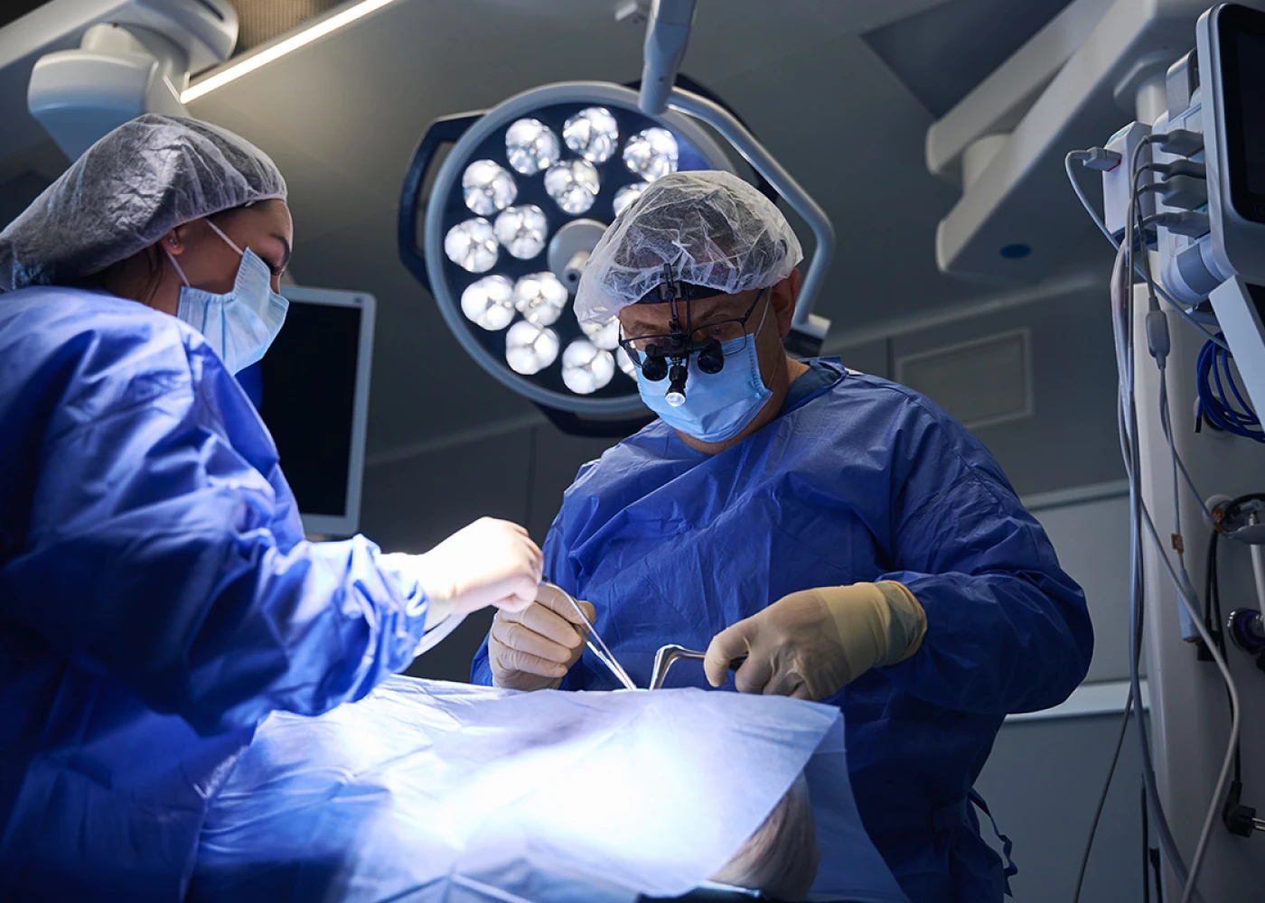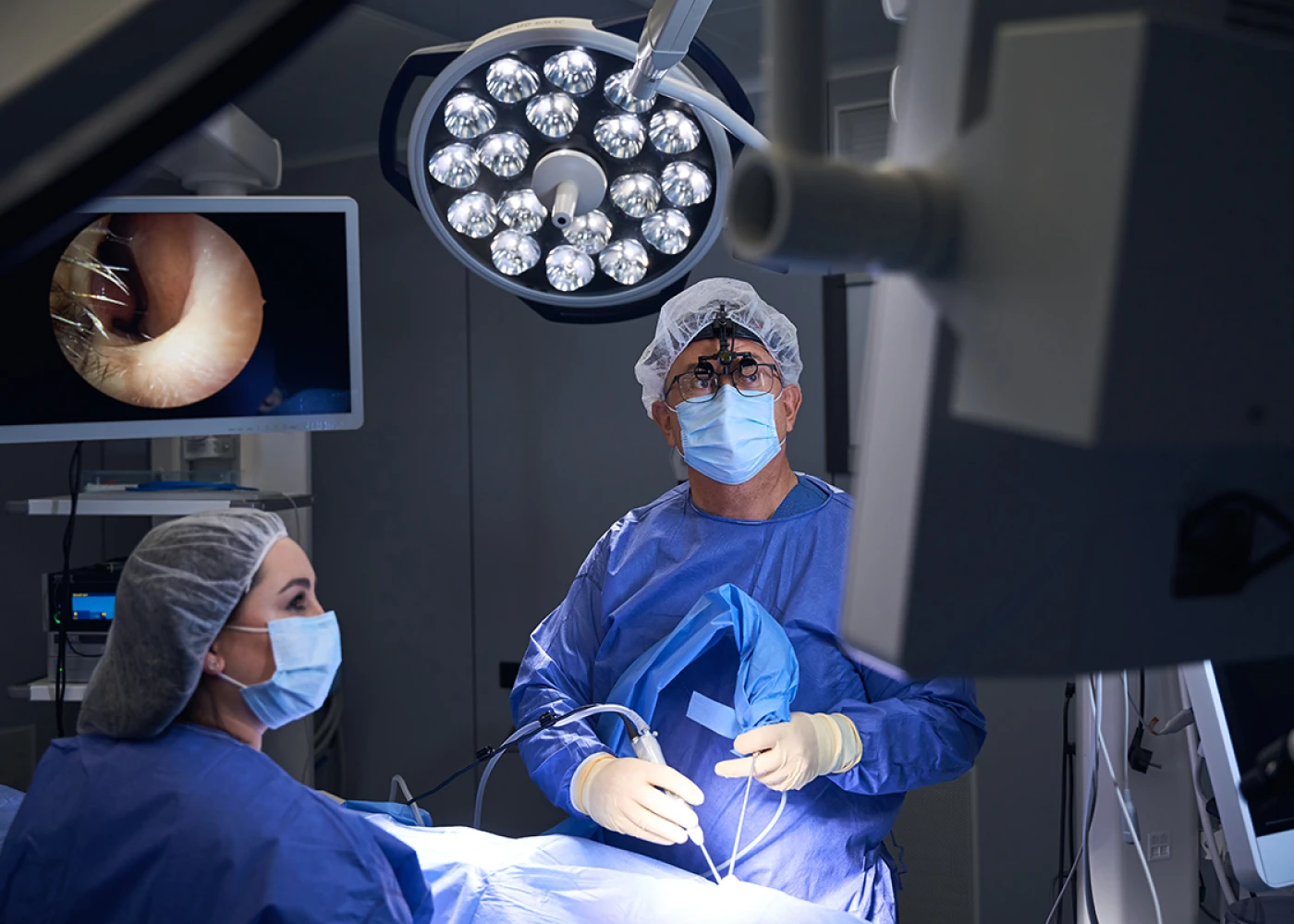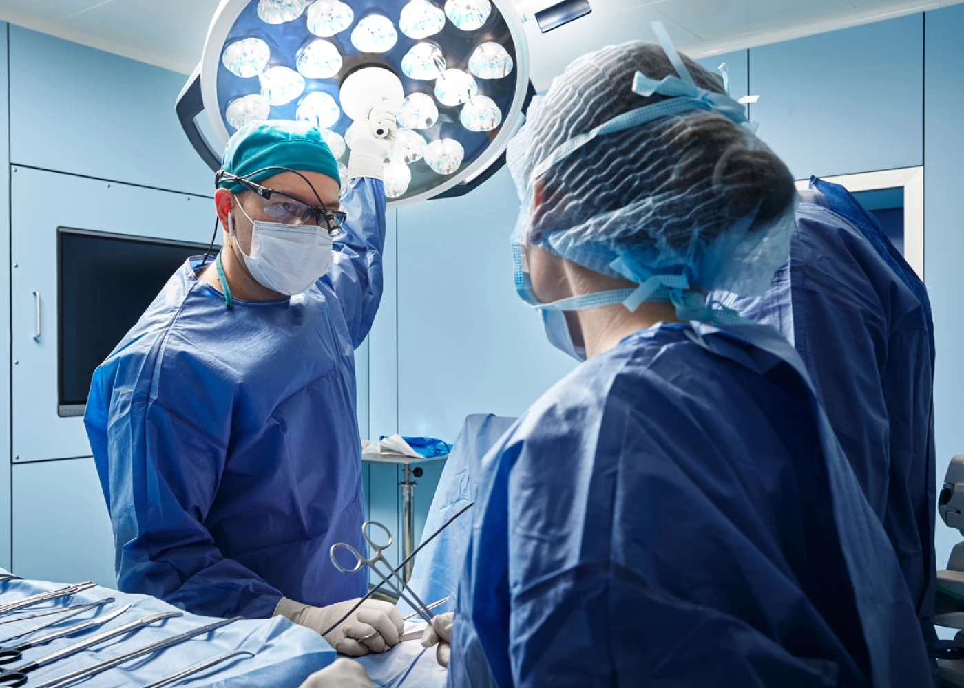 Используем специальные операционные лампы – сферическое освещение. Интенсивность освещения в ране увеличивается благодаря применению хирургами налобных ламп. Они обеспечивают идеальную визуализацию при «открытой» хирургии.