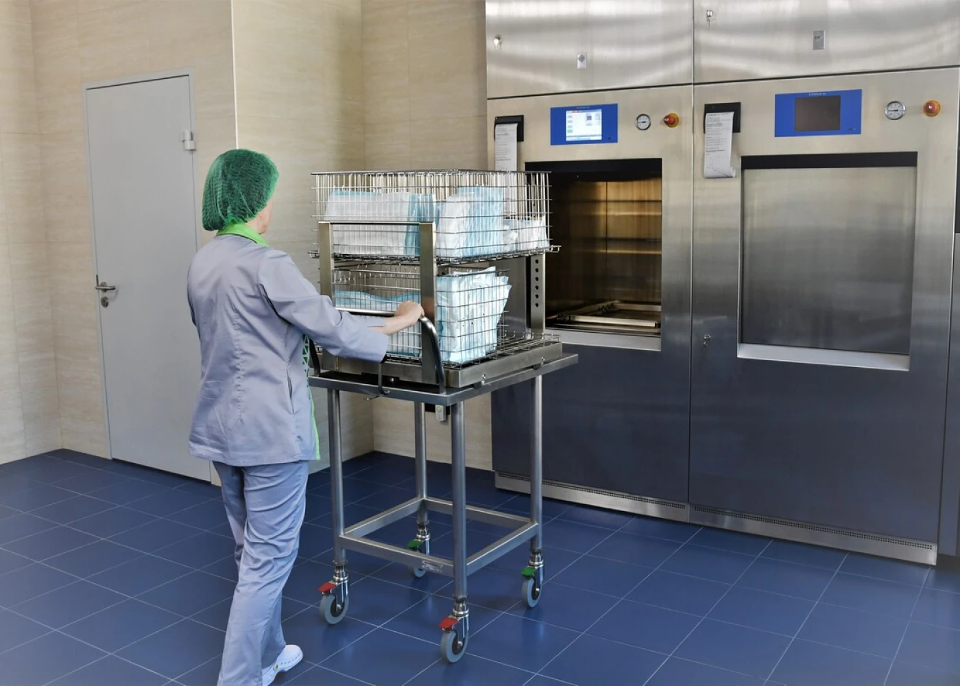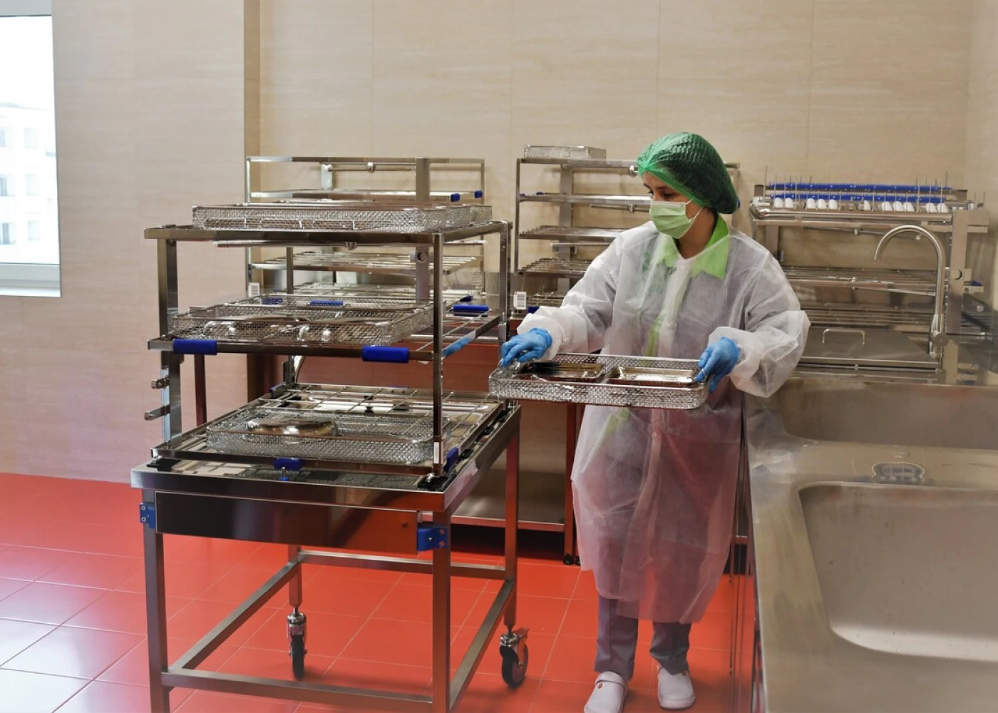 Отделение разделено на зоны: красную — “грязную”, синюю — “чистую” и зеленую — “стерильную”. Каждая зона изолирована от других и обозначена цветом напольной плитки.