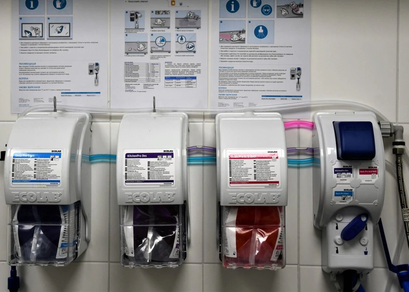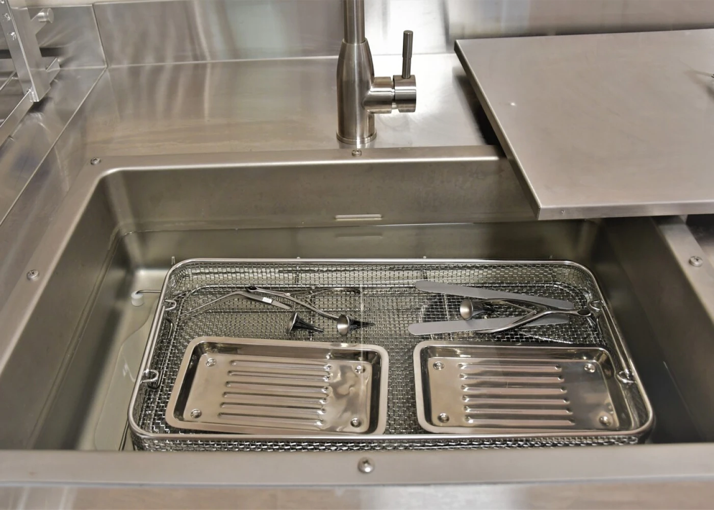 Использованный инструмент попадает в красную зону, где сначала дезинфицируется в специальном растворе в ультразвуковой мойке