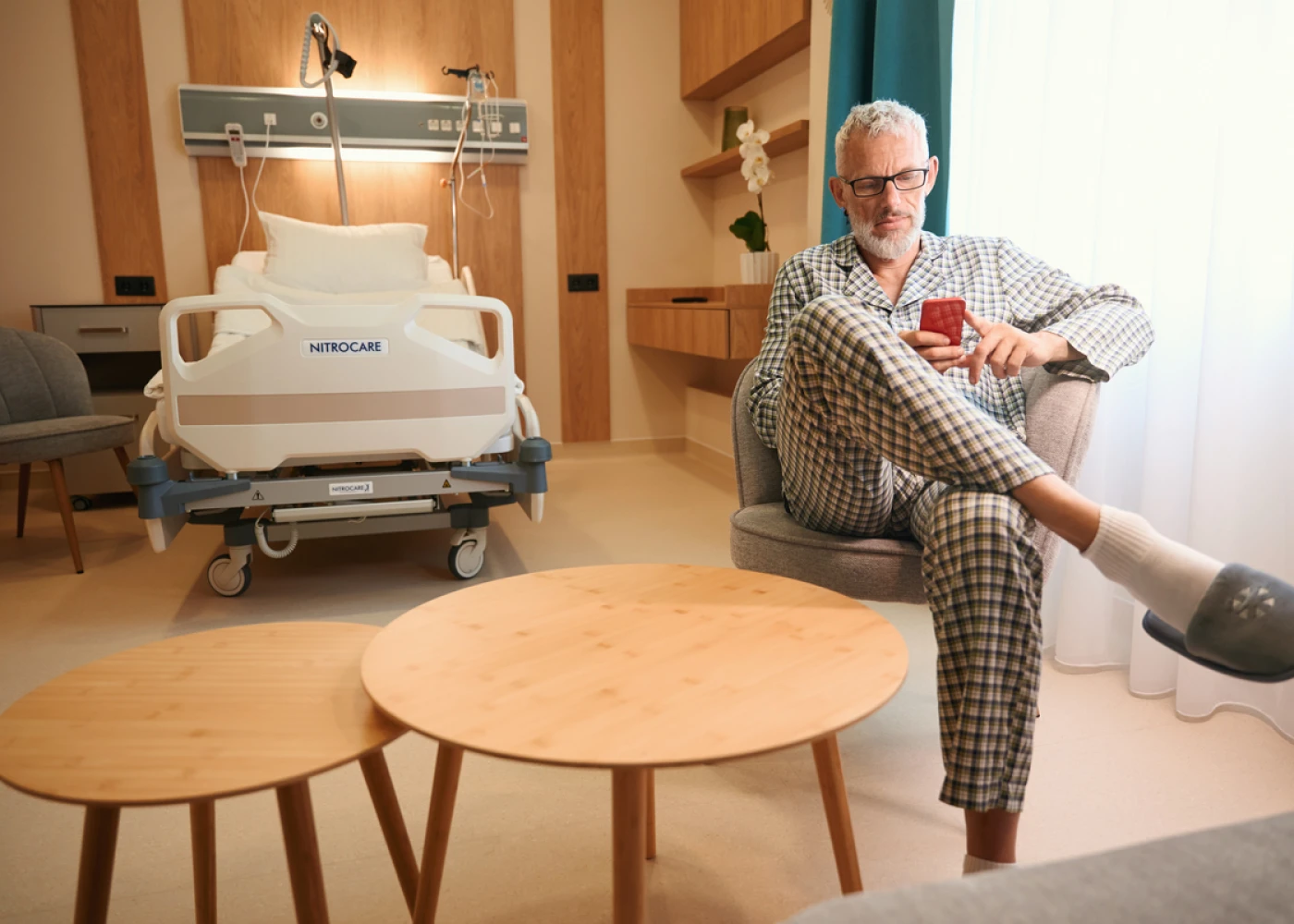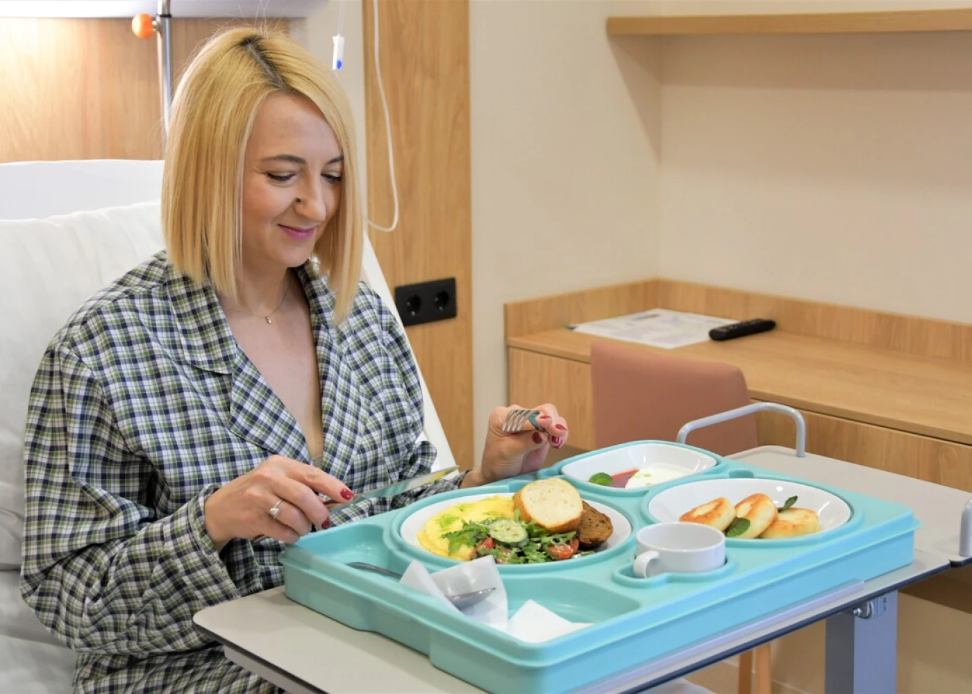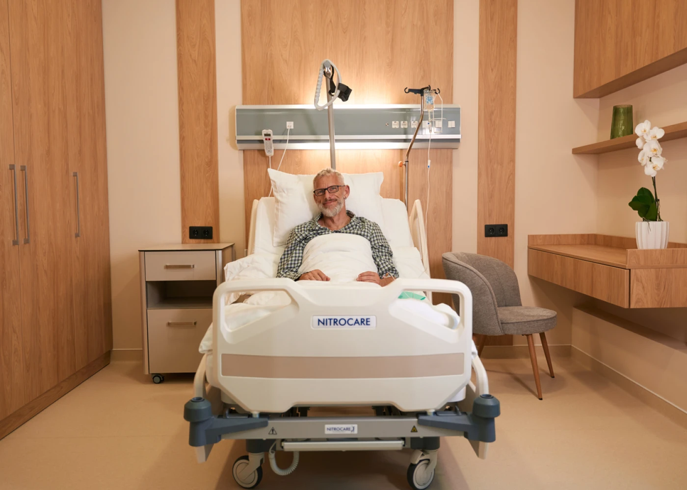 Номера оборудованы функциональными кроватями Nitrocare (Турция), регулируемыми для максимального удобства. Многофункциональный пульт позволяет не только переключать каналы ТВ, но и регулировать кровать, освещение, вызывать персонал