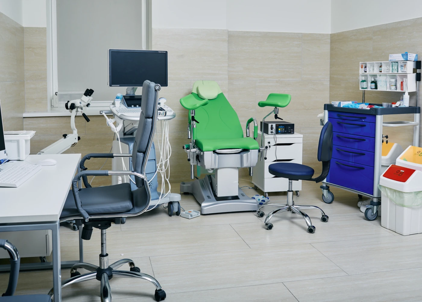 Кабинет для осмотра продуман таким образом, чтобы все процедуры, УЗИ и кольпоскопию можно было провести, не вставая с кресла и без необходимости куда-то перемещаться.