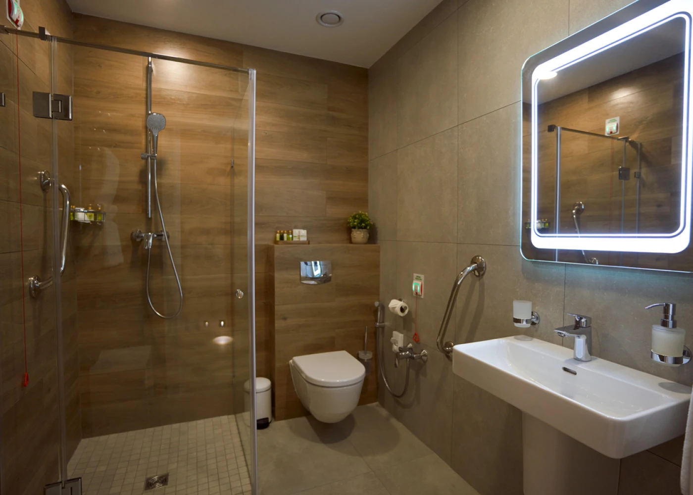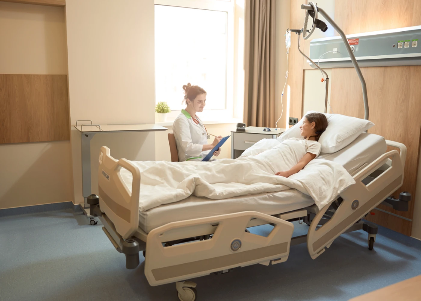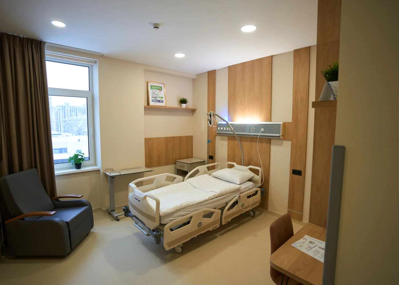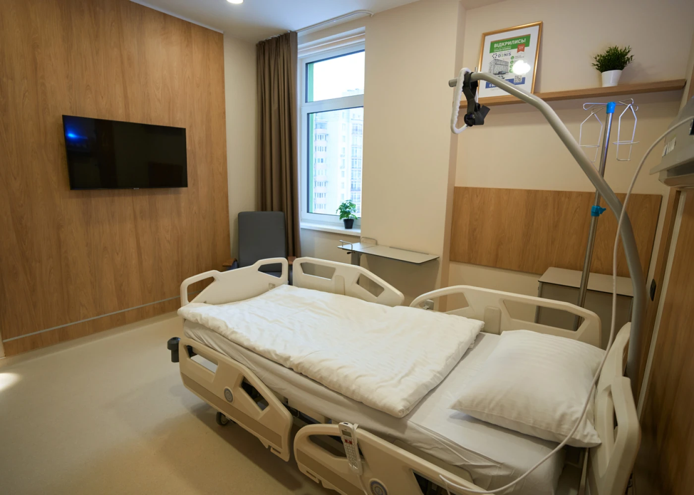 Номера оборудованы функциональными кроватями Nitrocare (Турция), которые регулируются для максимального удобства. Многофункциональный пульт позволяет не только переключать каналы ТВ, но и регулировать кровать, освещение, вызывать персонал.