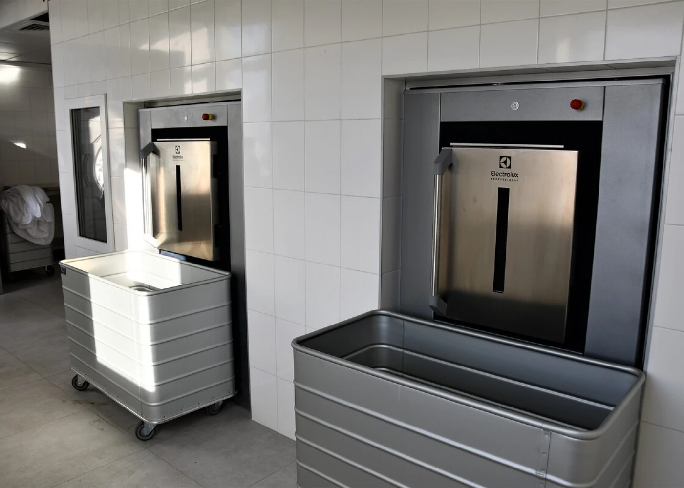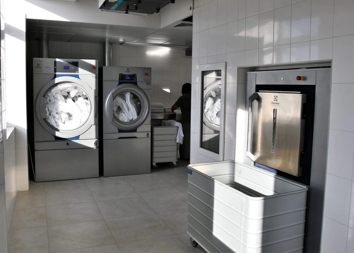 В прачечной установлены стиральные машины барьерного типа. Это означает, что загрузка грязного белья проводится в одном помещении, а выгрузка чистого — в другом.