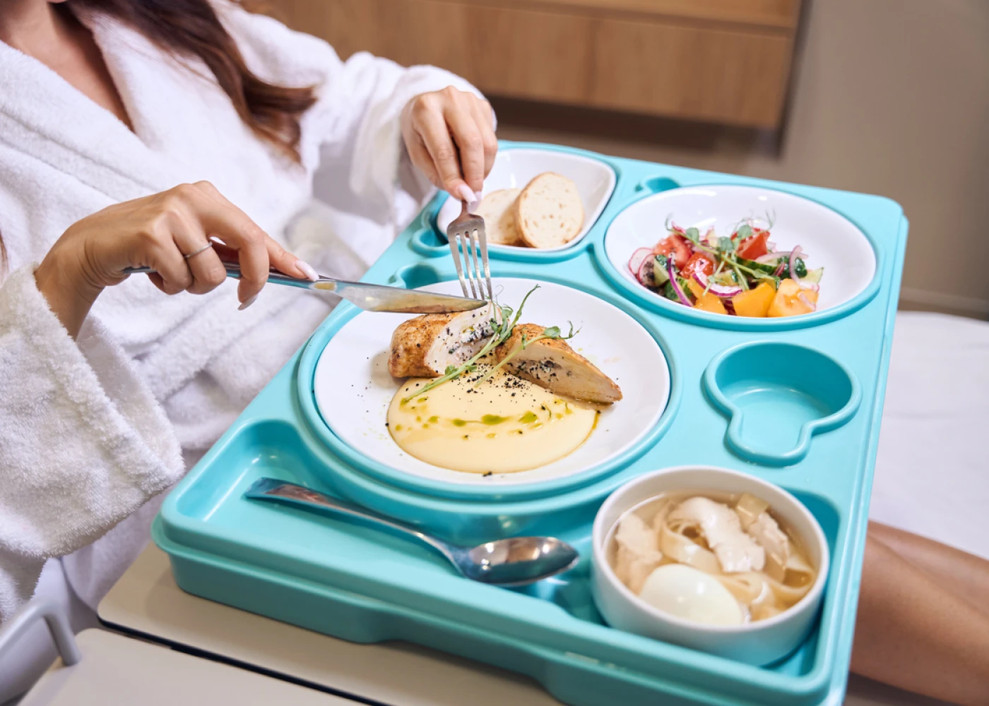 Питание обеспечивает собственная кухня ресторанного уровня, с возможностью выбора блюд по меню (с учетом диеты, прописанной врачом)