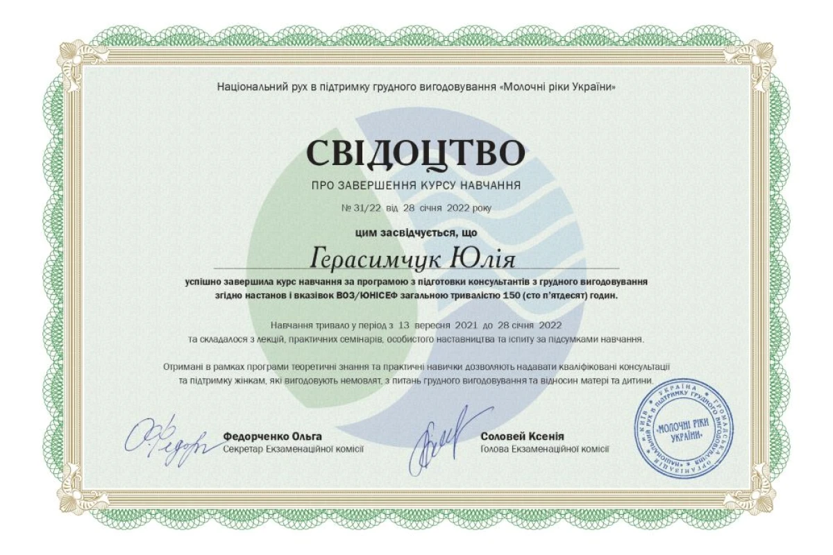 - 2021 - 2022: курс обучения по программе по подготовке консультантов по грудному вскармливанию согласно указаниям и указаниям ВОЗ/ЮНИСЕФ в Национальном движении в поддержку грудного вскармливания «Молочные реки Украины»