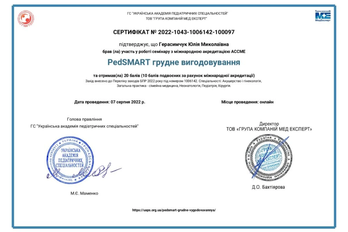 - Семинар с международной аккредитацией ACCME «PedSMART ¦Грудное вскармливание»