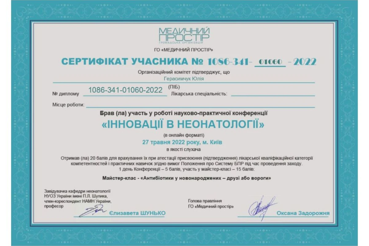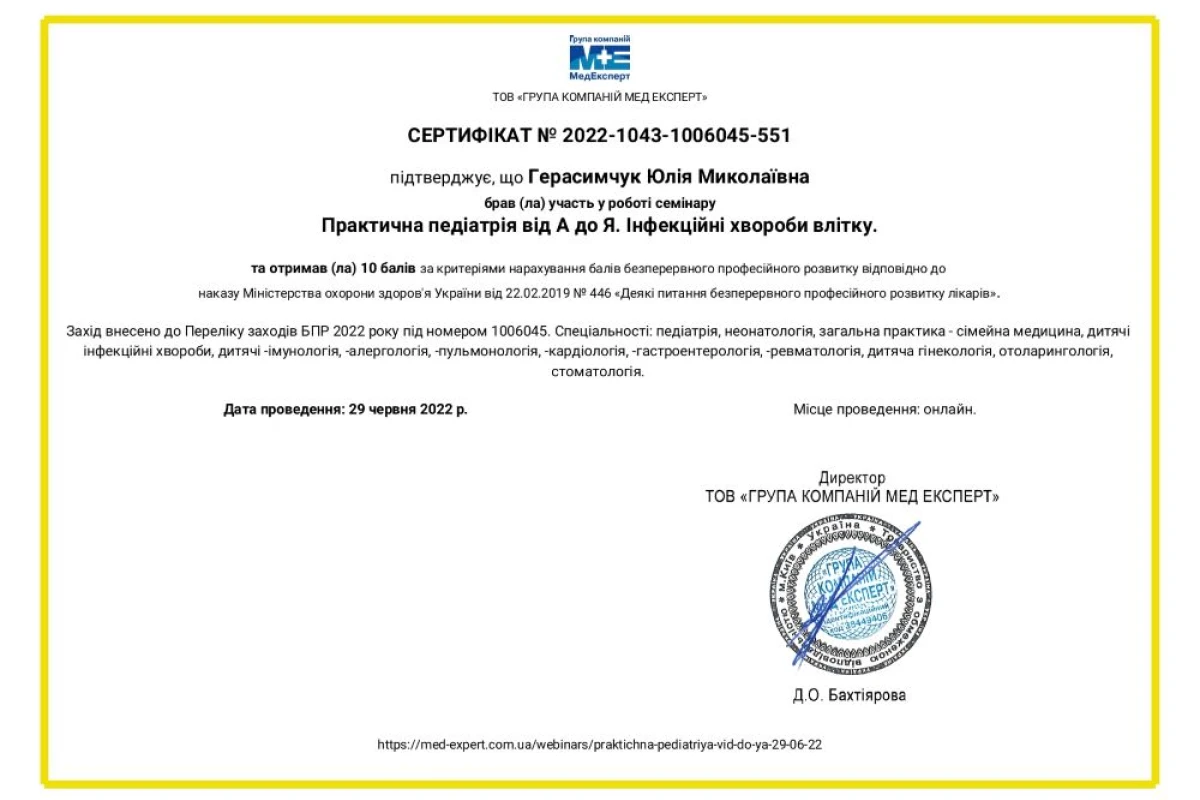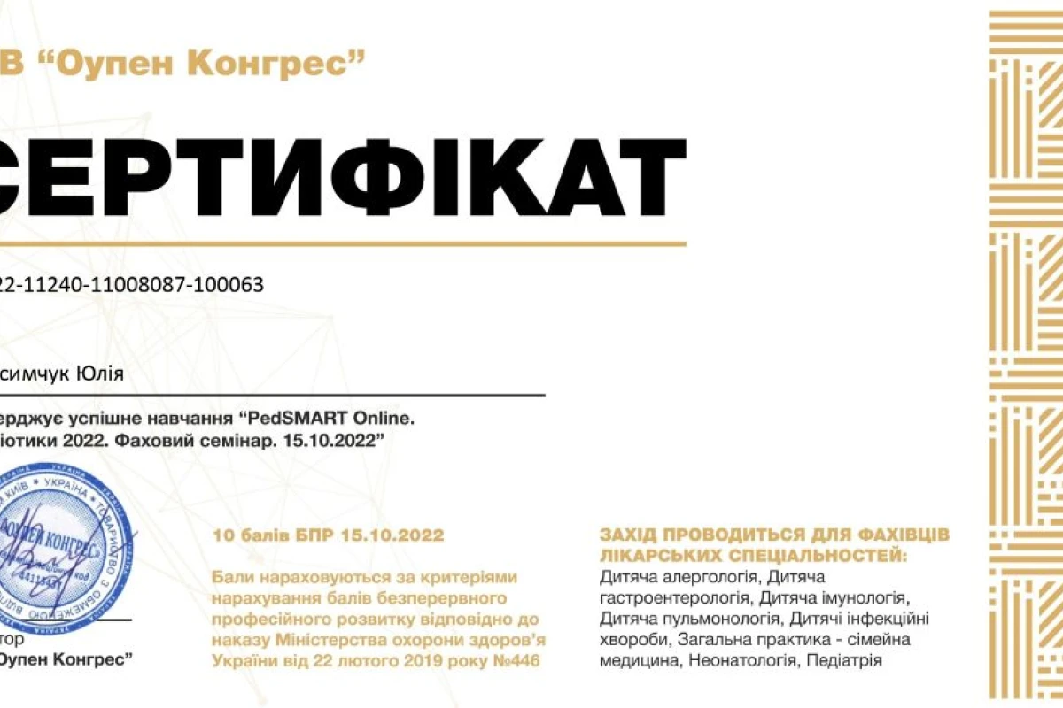 - 2009 – 2015: НМУ им.О.А. Богомольца – полное высшее образование по специальности «педиатрия»