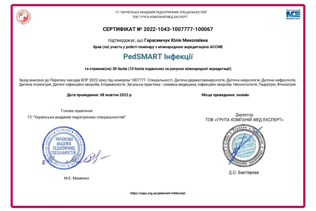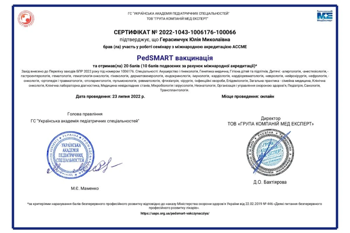 - Семинар с международной аккредитацией ACCME «PedSMART вакцинация»