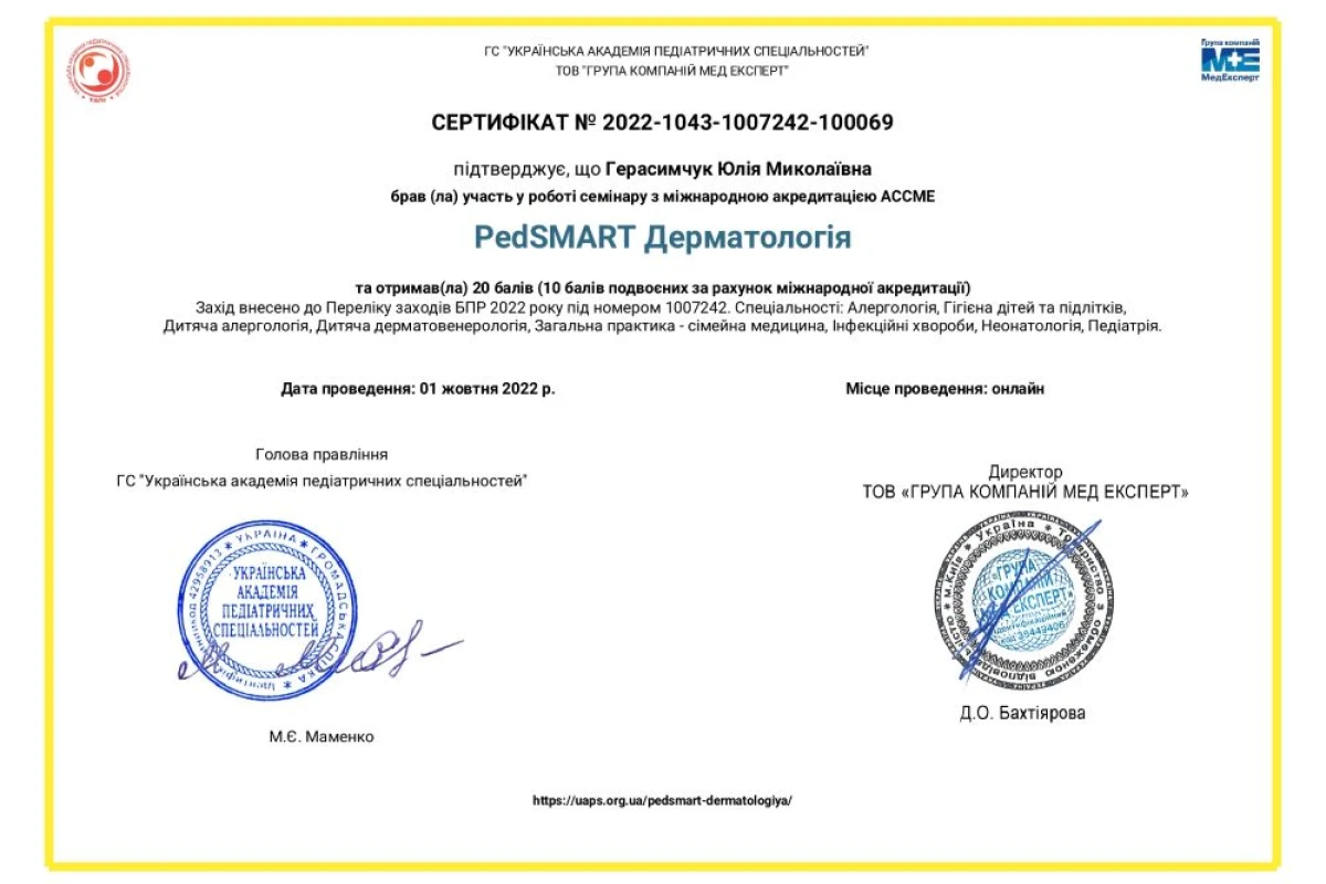 - Семинар с международной аккредитацией ACCME «PEDSMART Дерматология. Детская кожа. Сложные диагностические случаи»