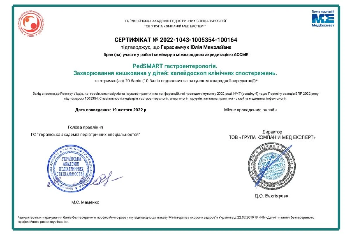 - Семинар с международной аккредитацией ACCME «PedSMART гастроэнтерология. Заболевания кишечника у детей: калейдоскоп клинических наблюдений»