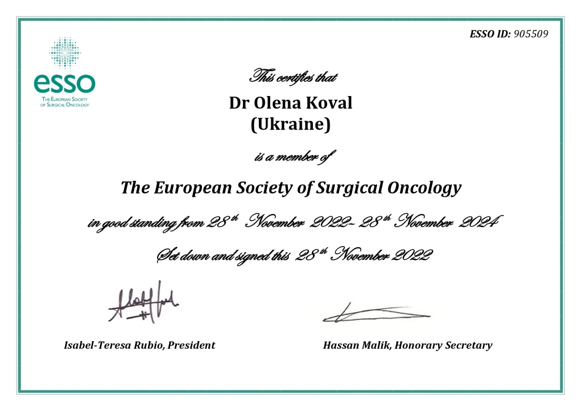 - 2019: Киевская медицинская академия последипломного образования – специализация по онкохирургии.