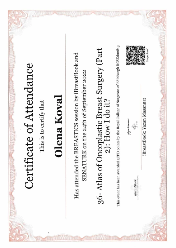 - 2021: Украина, Харьковская Медицинская Академия Последипломного Образования — ТУ по онкопластической хирургии груди.