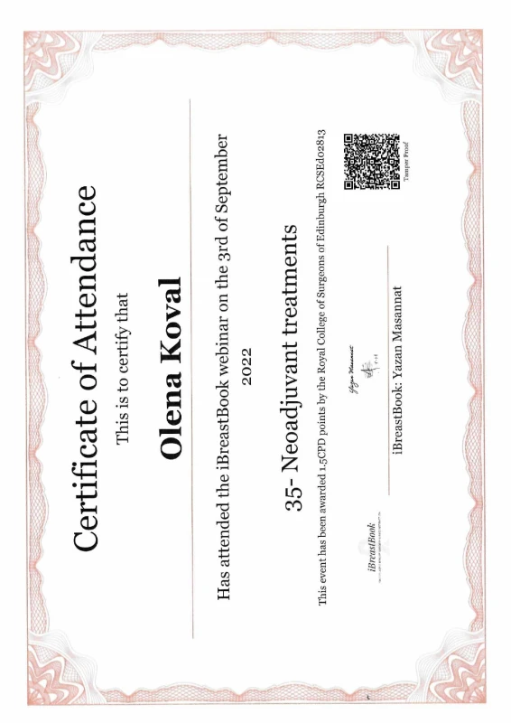 - 2022: Украина, Клиника «Лисод», вебинар MSD «Трижды отрицательный рак молочной железы, результативные подходы к ведению пациентов».