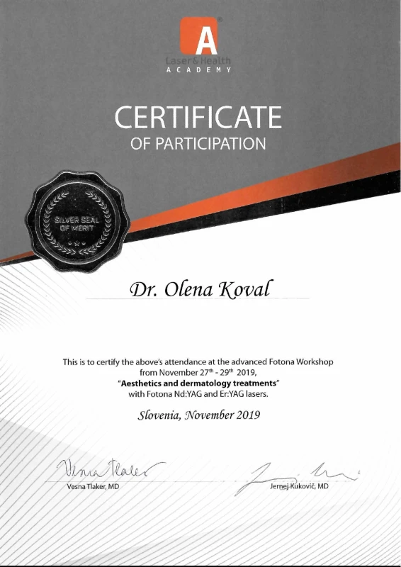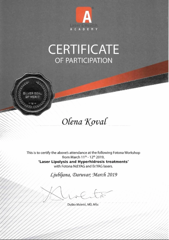 - 2019: Словения, Академия Лазерной Медицины — Fotona Laser&Health Academy — стажировка по лазерной медицине, стажировка по лазерной хирургии.