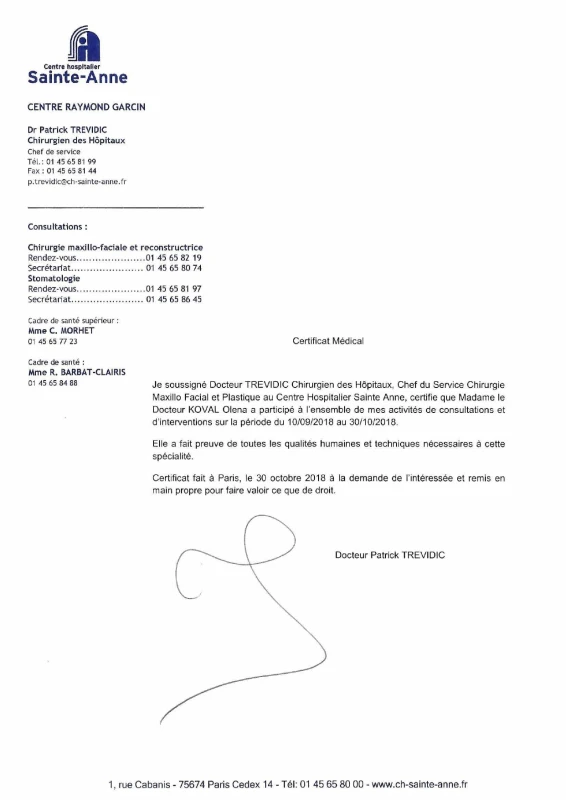 - 2002-2019: Франция, Париж, Clinique Remusat, Centre Hospitalier Sainte Anne — ежегодная стажировка по пластической и реконструктивной хирургии лица, груди и тела.
