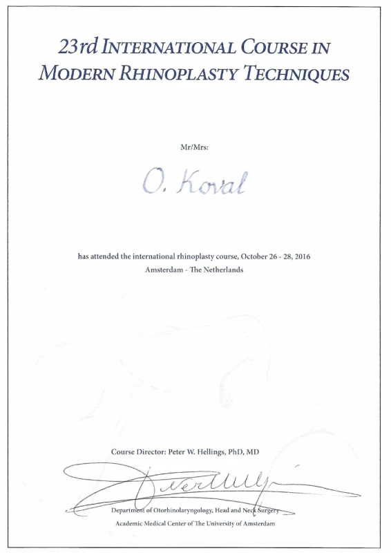 - 2016: Нидерланды, Медицинский Университет Амстердама – International Course in Modern Rhinoplasty Techniques — теоретический и практический курс по реконструктивной и эстетической хирургии носа.