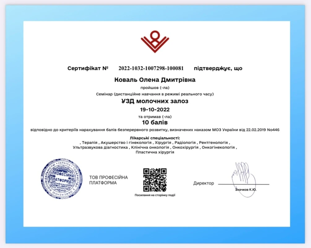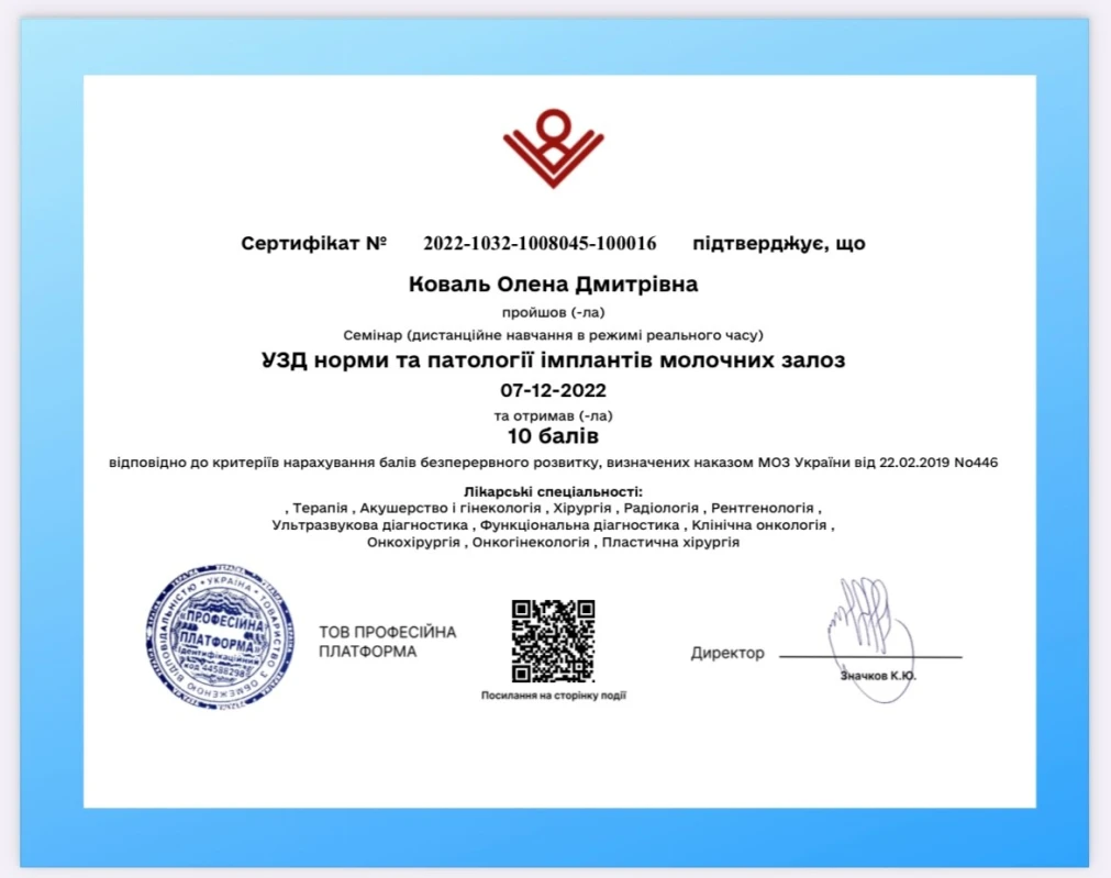 - 2022: Украина, Профессиональная платформа — семинар «УЗИ молочных желез».