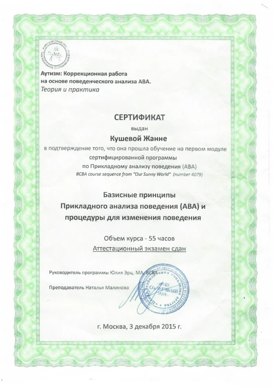 - 2015: Сертификат о прохождении курса и модуля сертифицированной программы по прикладному анализу поведения (АВА) ВСВА course sequence from “Our Sunny World”. Тема: "Базисные принципы прикладного анализа поведения (АВА) и процедуры изменения поведения".