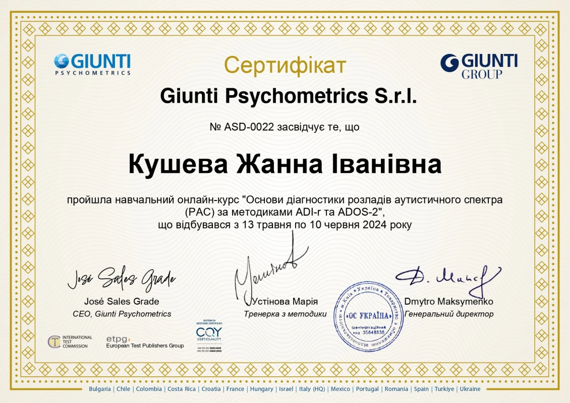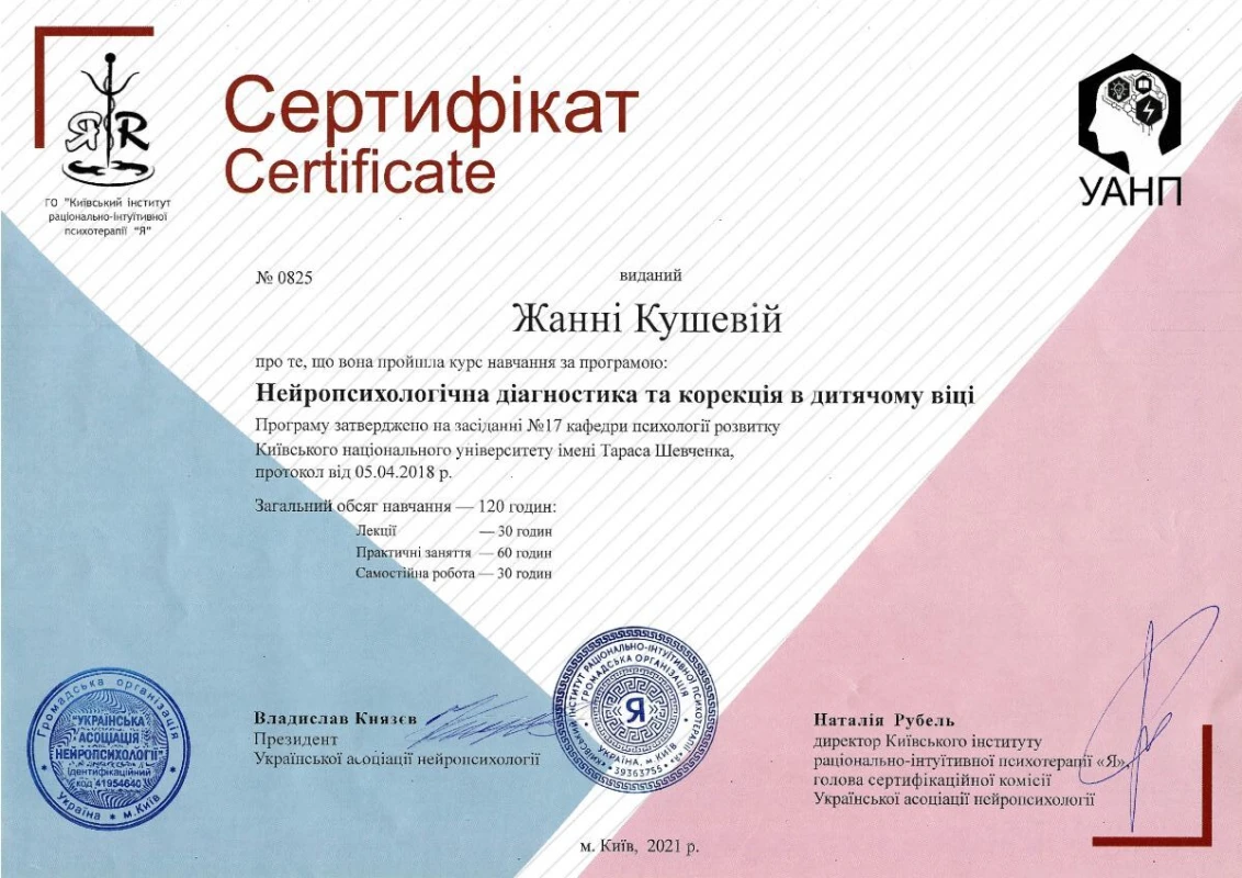 - 2021: Сертификат о прохождении курса по программе "Нейропсихологическая диагностика и коррекция в детском возрасте". "Киевский институт рационально-интуитивной психотерапии" "Я".