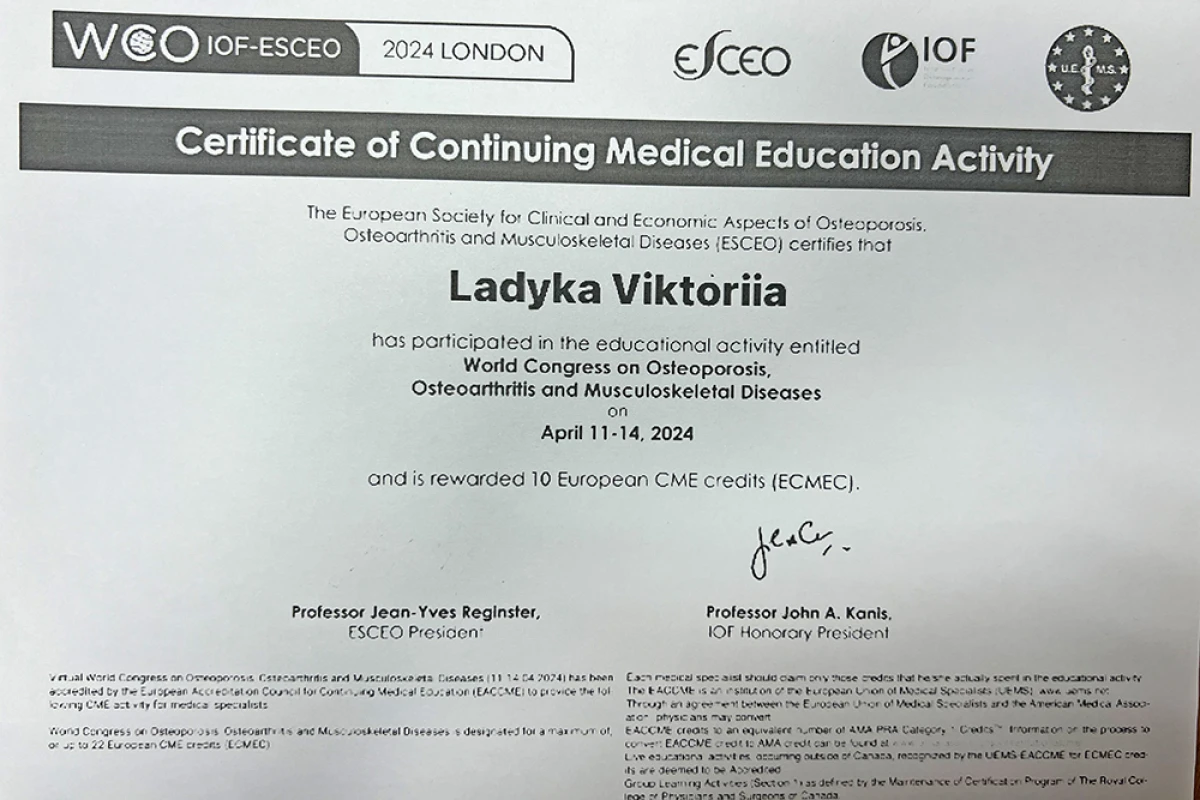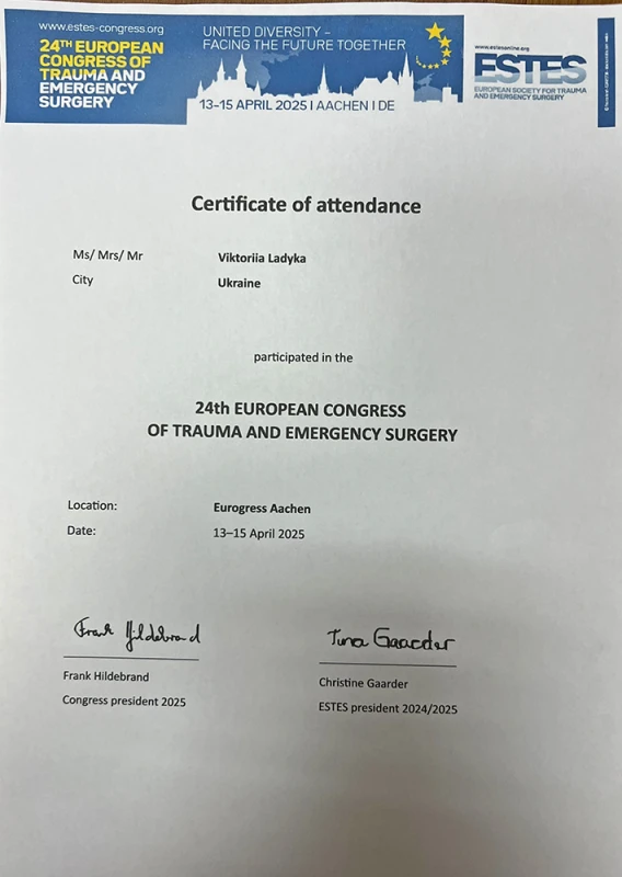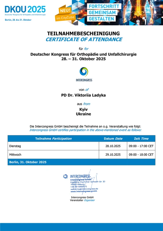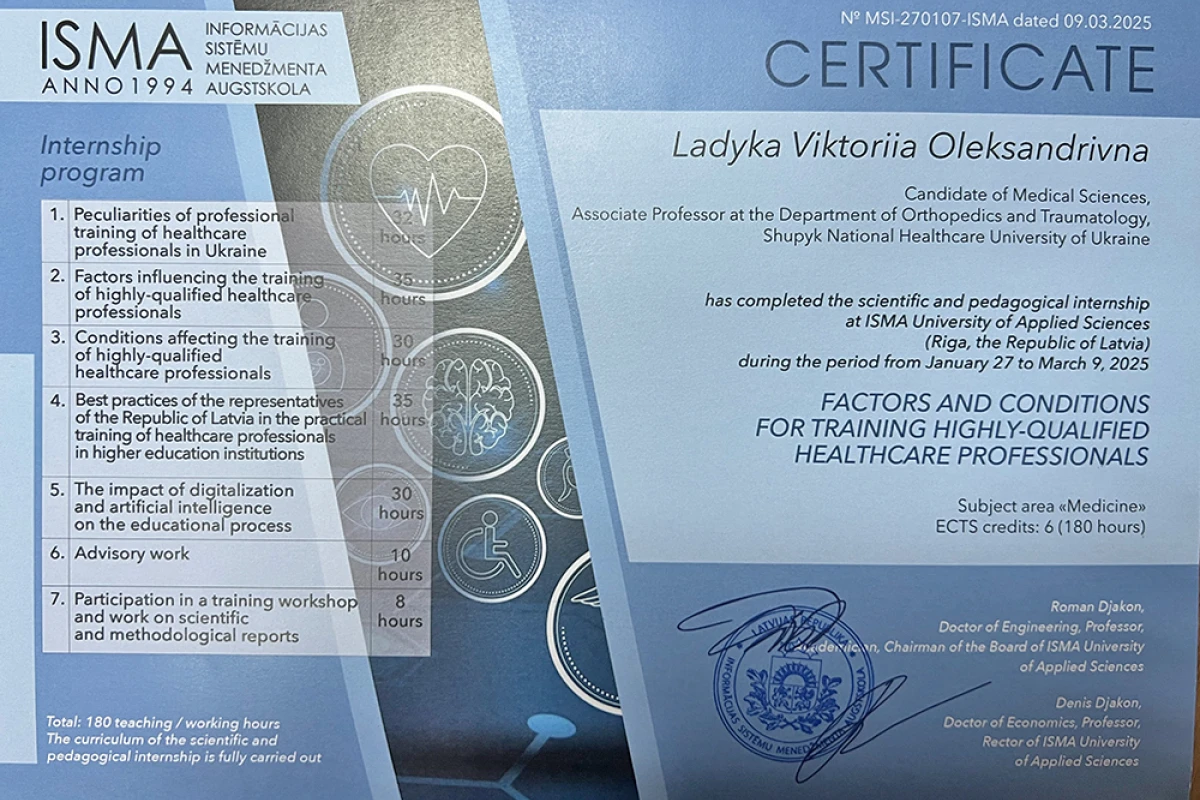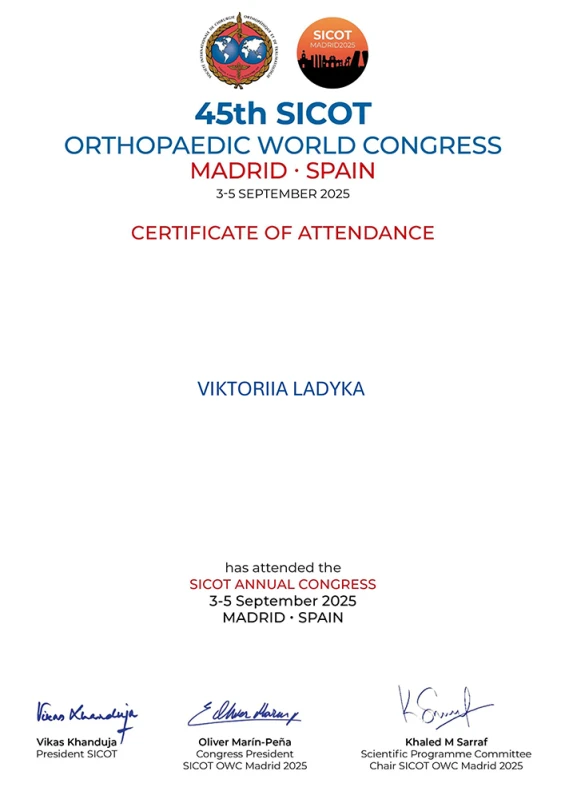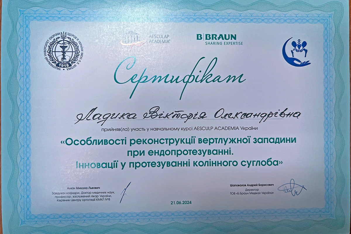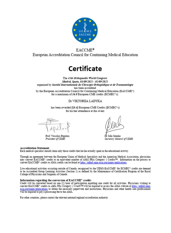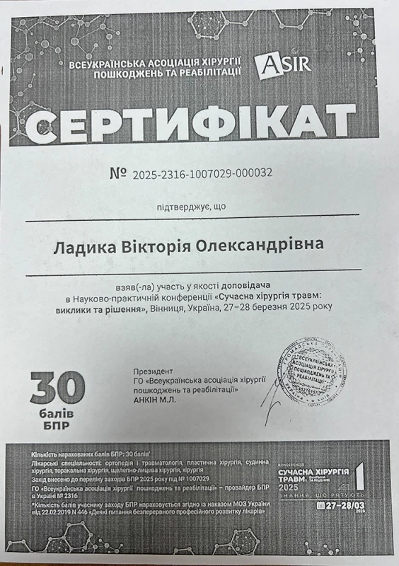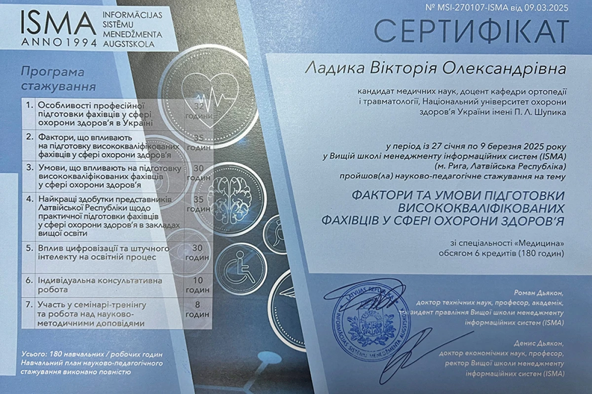 - 2025: На ученом совете получаю ученое звание доцент кафедры ортопедии травматологии НУОЗ Украины имени П.Л. Шупика.(документы представлены в МОН Украины).