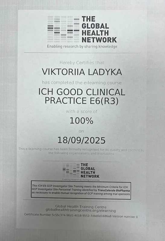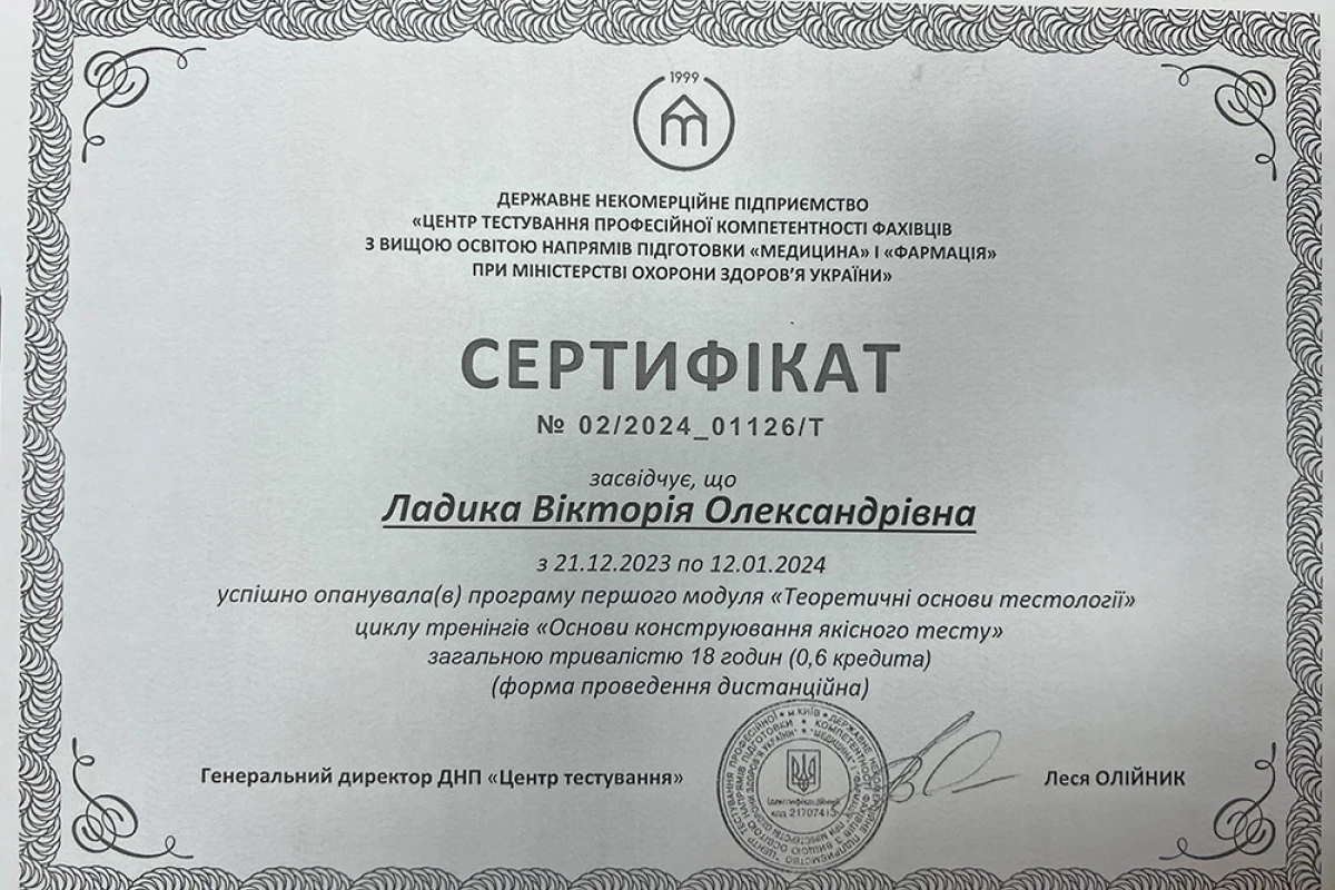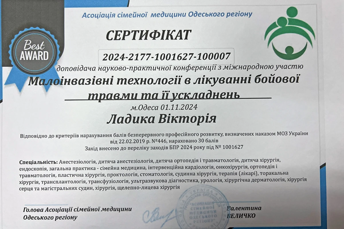 - 2018: прошла аттестацию в аттестационной комиссии при Министерстве здравоохранения Украины и получила первую категорию по специальности «Ортопедия и травматология» (удостоверение №1748 от 29.12.2018 г.).