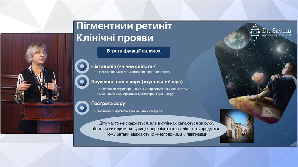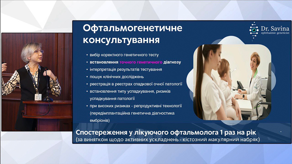 Елена Савина — не только опытный офтальмолог, но и обладает редкой для Украины специализацией офтальмогенетика. Именно офтальмогенетик занимается диагностикой и лечением наследственных глазных патологий, выявляя их генетическую природу. Благодаря профессиональному консультированию и выявлению мутаций врач помогает пациентам прервать цепь наследования тяжелых болезней в семье.