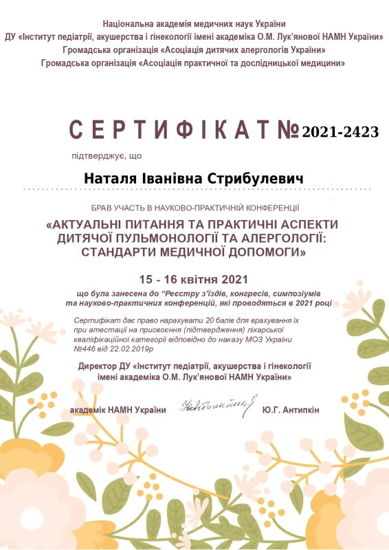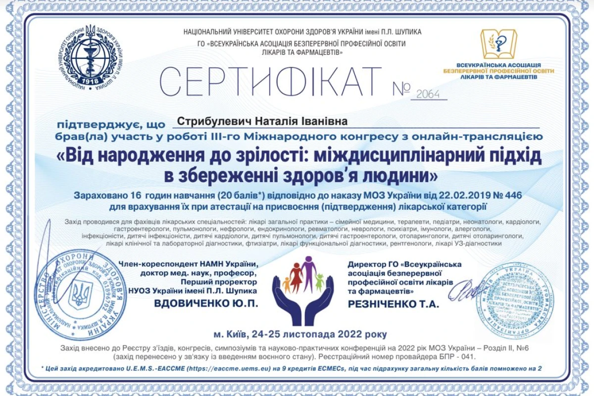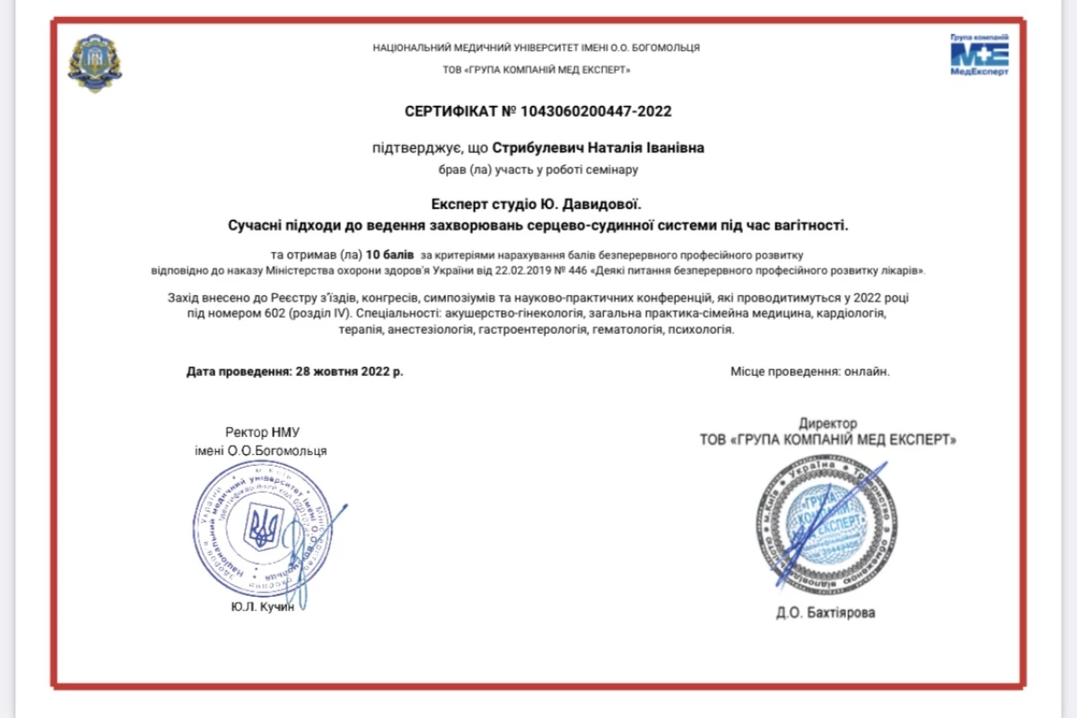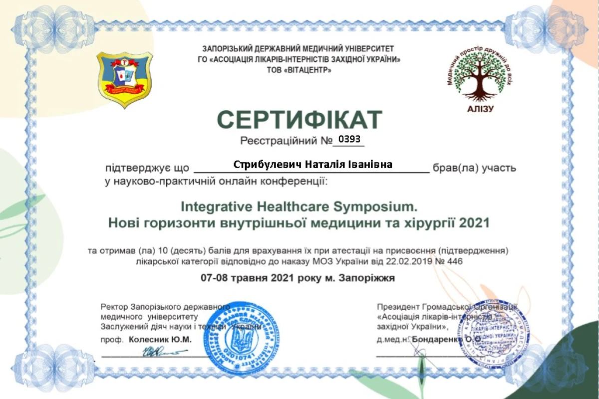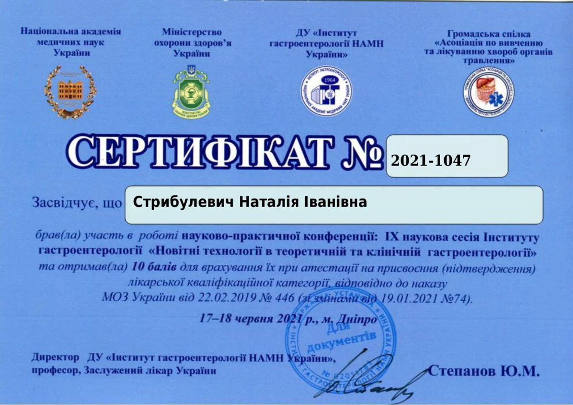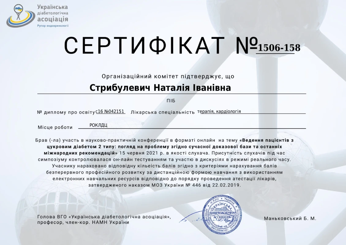 - 2021: курсы по функциональной диагностике на базе РОКЛДЦ в г. Ровно.