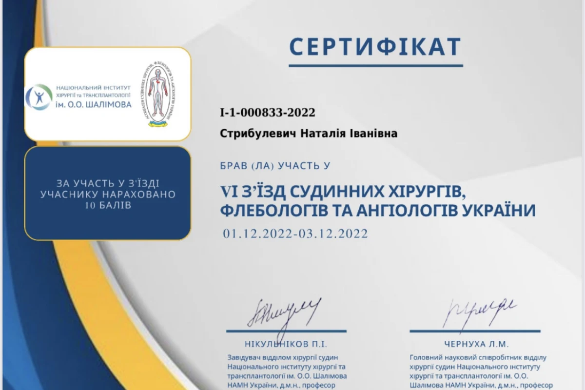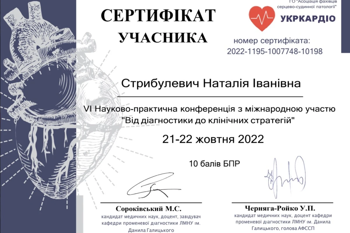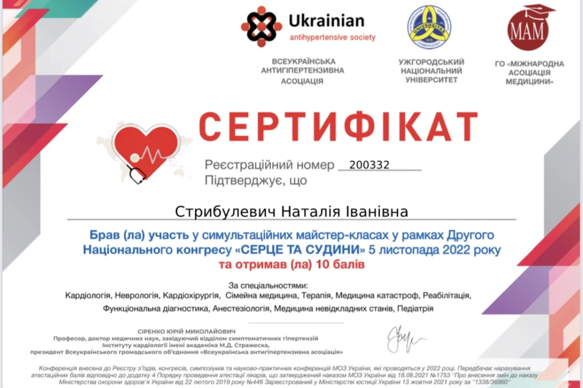 - 2018: курсы специализации по кардиологии на базе НМАПО им.Шупика в г.Киев