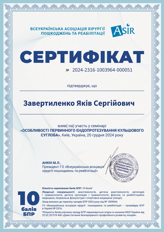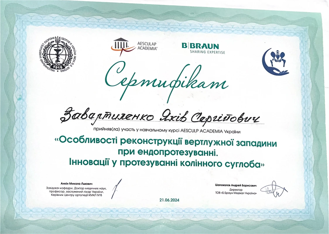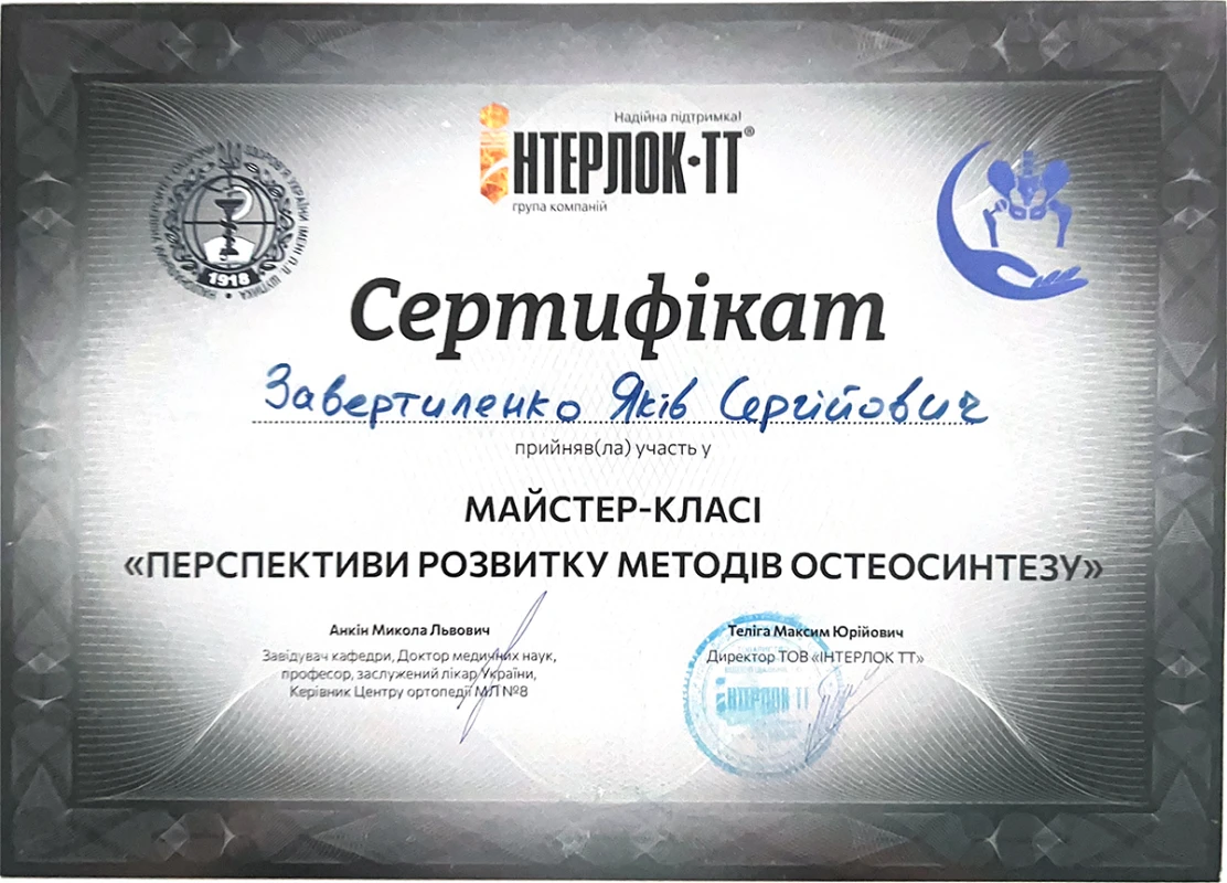 - Интернатура по специальности «Ортопедия и травматология». Национальный университет здравоохранения Украины имени П. Л. Шупика