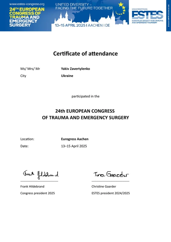 - Certificate of Presentation ECTES 2024 “Феатуры последствий последствий мини-blast pelvic injuries” 28–30 апреля 2024 года (соавтор)