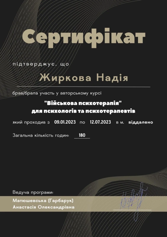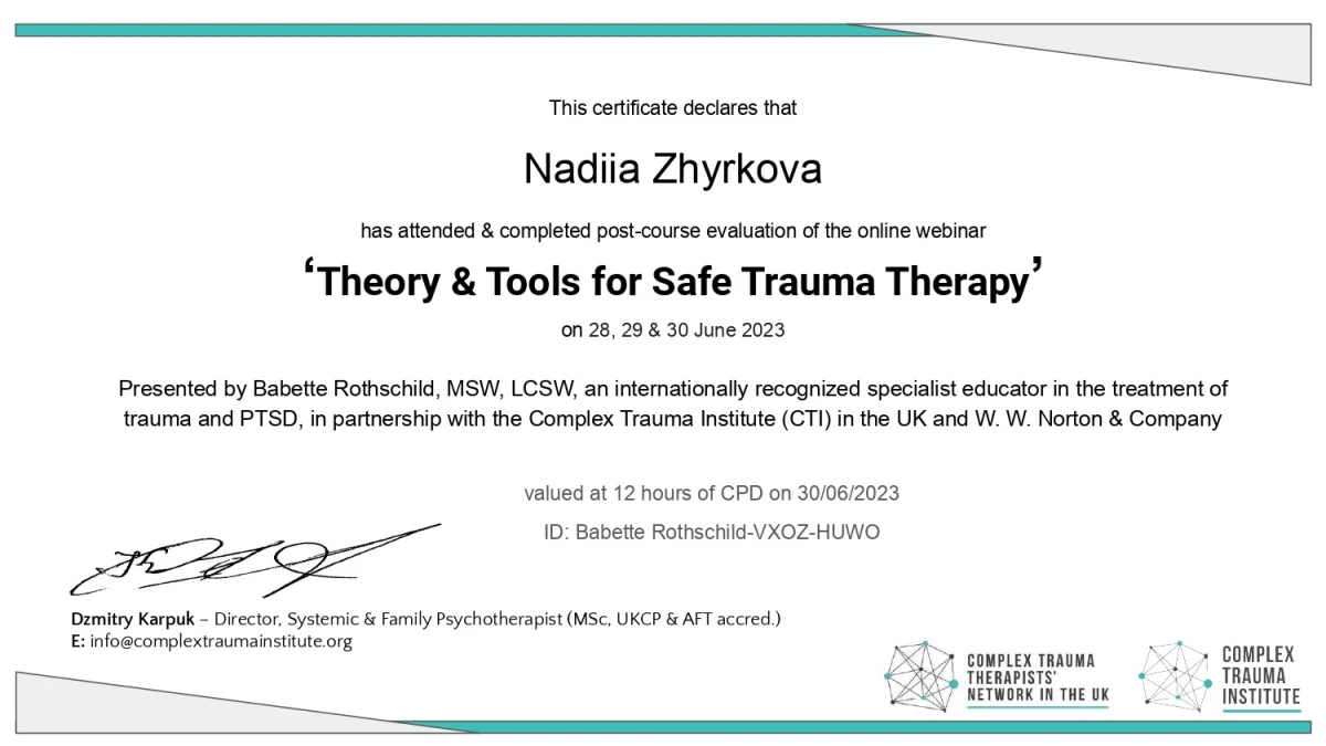 - 2023: Сертификационная программа "Клиническая психология", Киевский национальный университет имени Тараса Шевченко