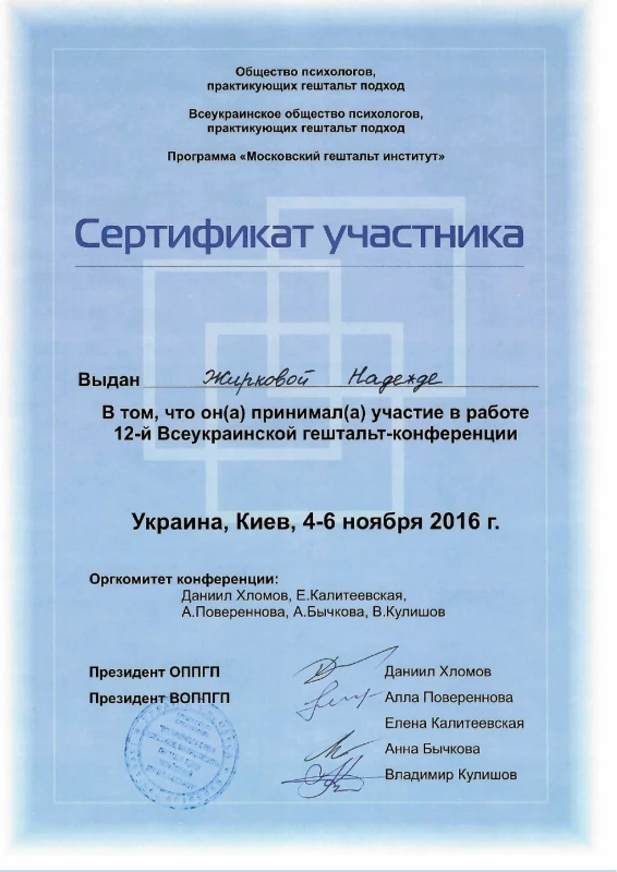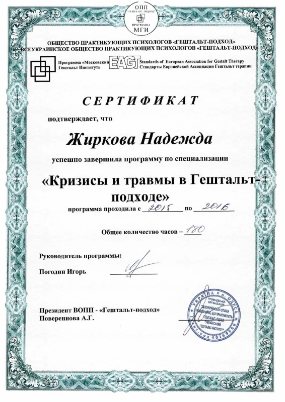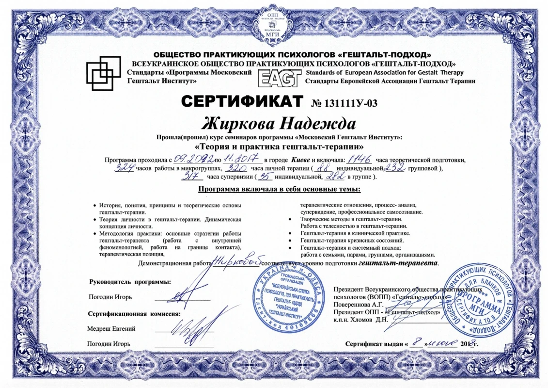 - Программа I-II степени «Теория и практика Гештальт-терапии», Национальная ассоциация гештальт терапевтов Украины, руководитель – Игорь Погодин
