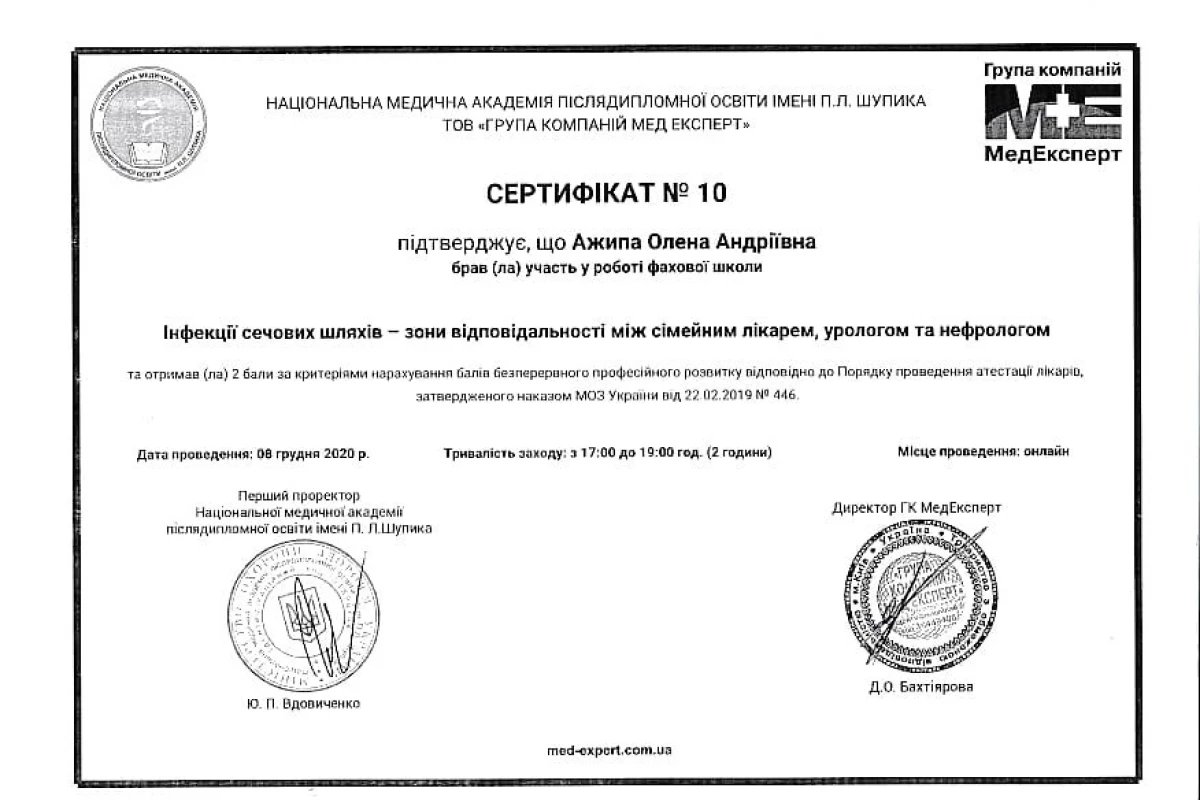 - 2015-2017: Інтернатура за спеціальністю педіатрія на базі КМДКЛ №2
