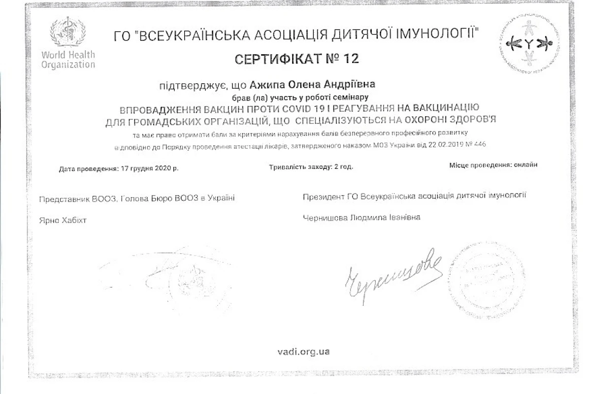 - 2017-2019: Кафедра педіатрії №2 НМУ імені О.О. Богомольця