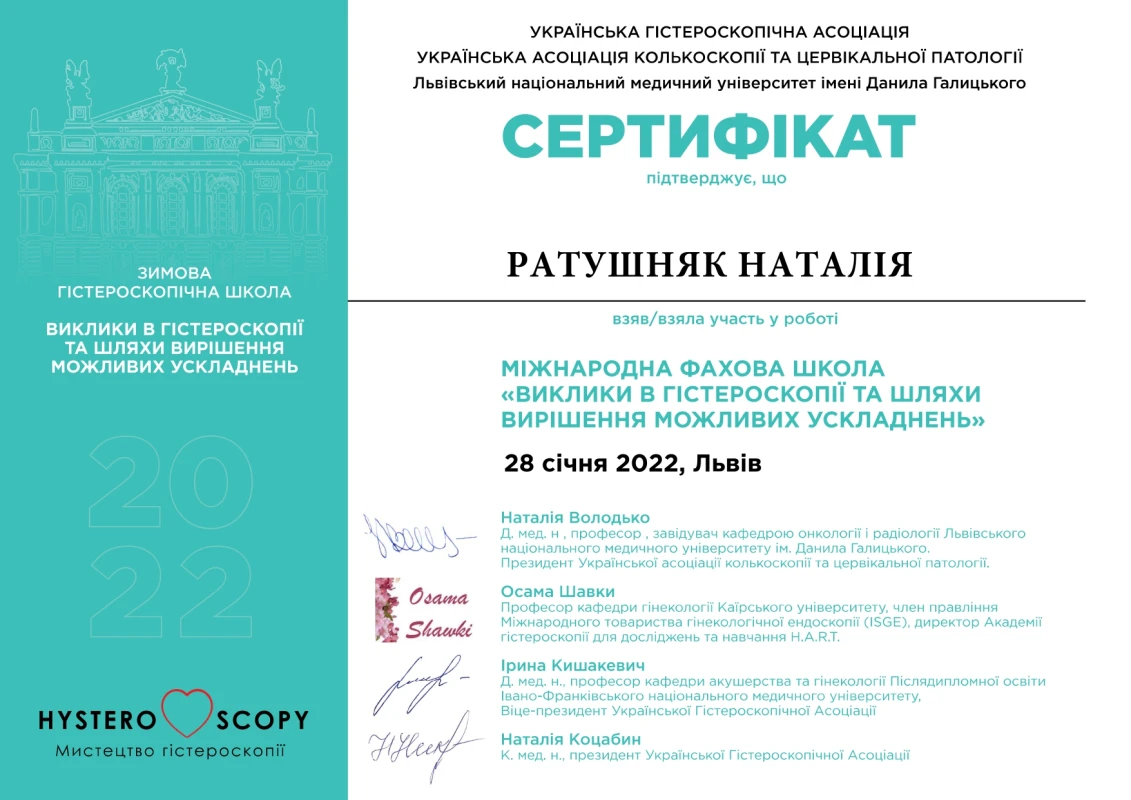- 2022: Міжнародна фахова школа «Виклики в гістероскопії та шляхи вирішення можливих ускладнень»