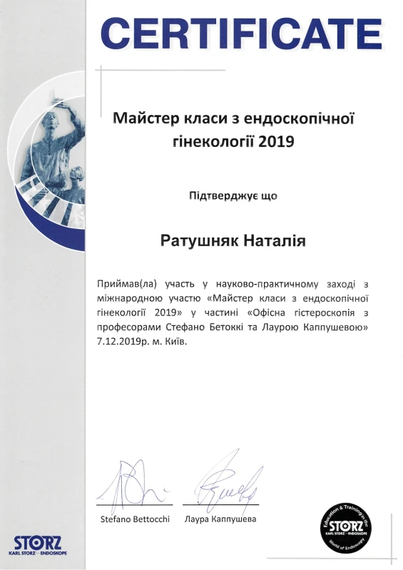 - 2019: «Офісна гістероскопія з професорами Стефано Бетоккі та Лаурою Каппушевою»