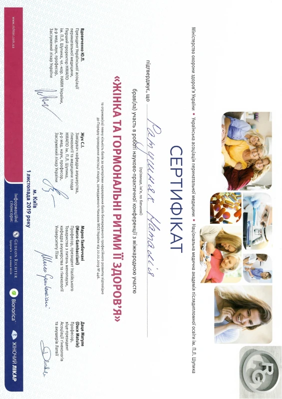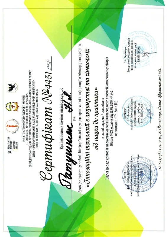 - 2019: «Майстер клас з ендоскопічної гінекології 2019» з міжнародною участю.