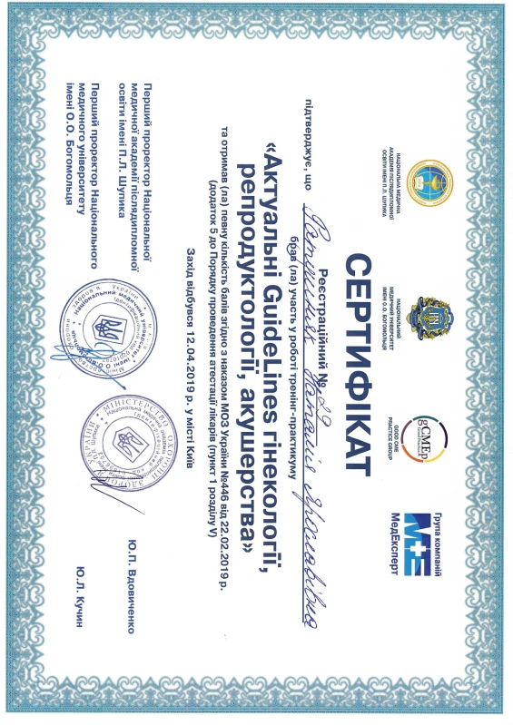 - 2019: «Актуальні GuideLines гінекології, репродуктології, акушерства»