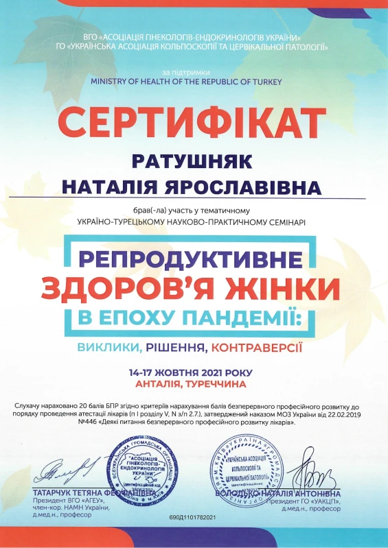 - 2021: Україно-Турецький науково-практичний семінар Репродуктивне здоров’я, Анталія, Туреччина.