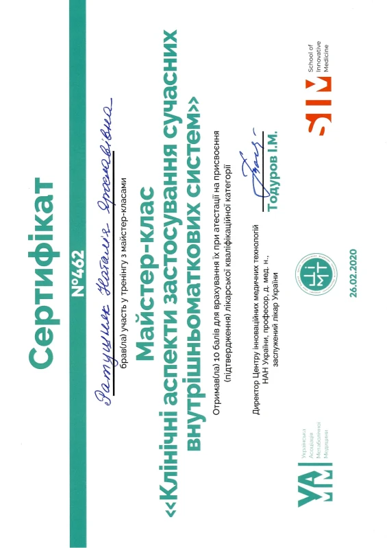 - 2022: ТУ «УЗД в акушерстві та гінекології»