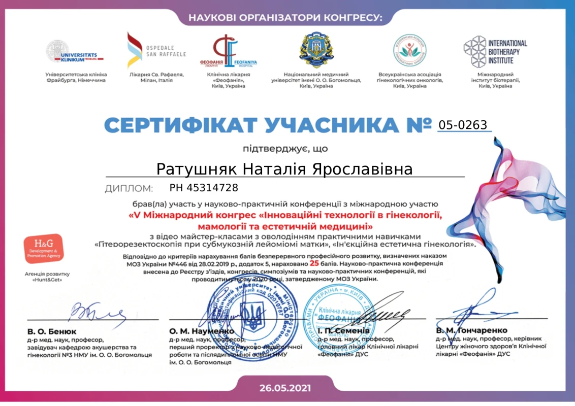 - 2021: «Міжнародний конгрес «Інноваційні технології в гінекології, мамології та естетичній медицині»