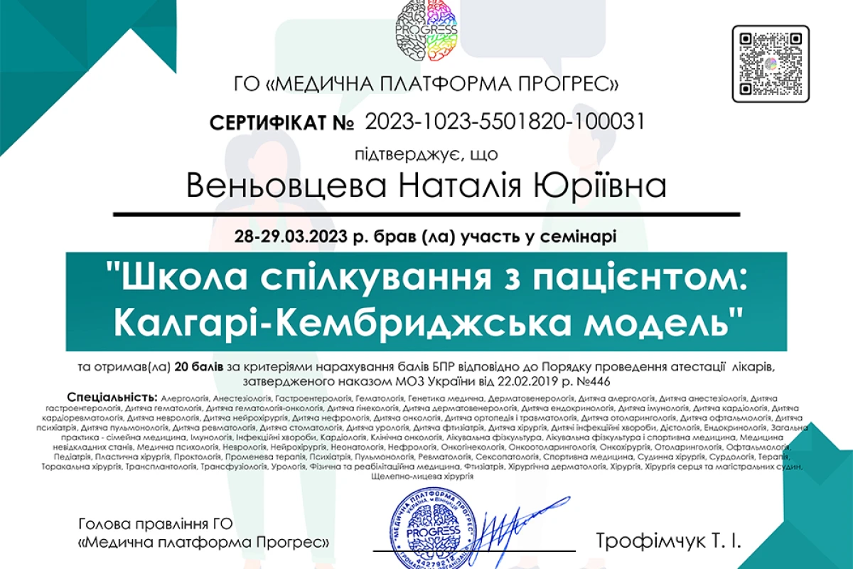 - 2023: Семінар: Школа спілкування з пацієнтом: Калгарі-кембриджська модель