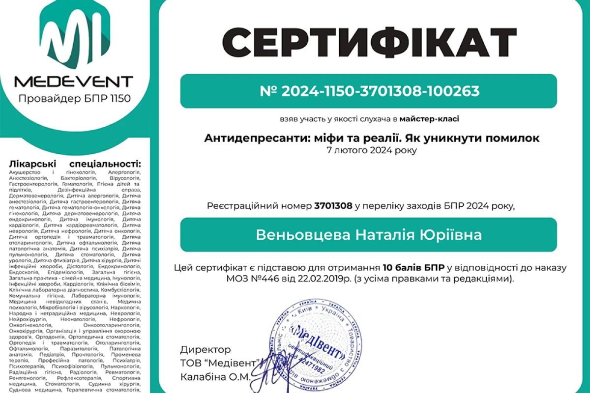- 2024: Майстер-клас: Антидепресанти: міфи та реалії. Як уникнути помилок.