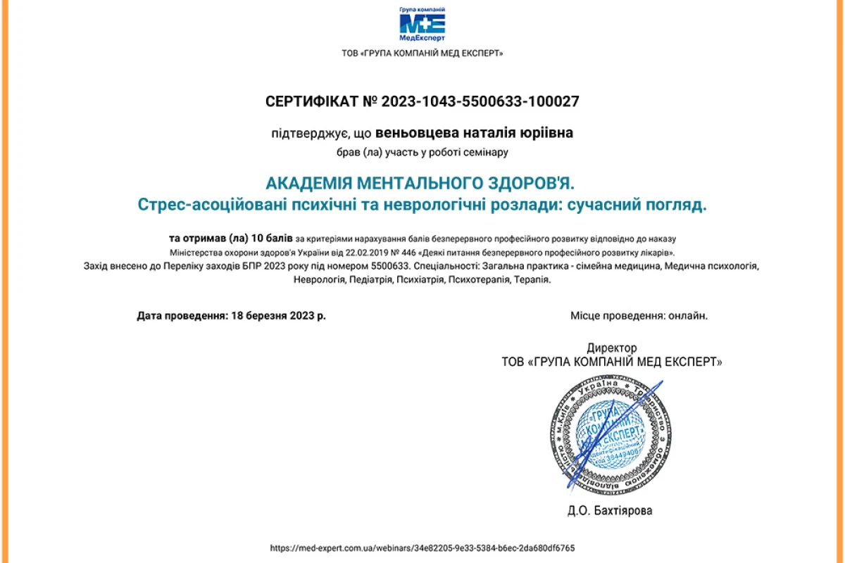- 2023: Семінар: Академія ментального здоров”я. Стрес-асоційовані психічні та неврологічні розлади: сучасний погляд
