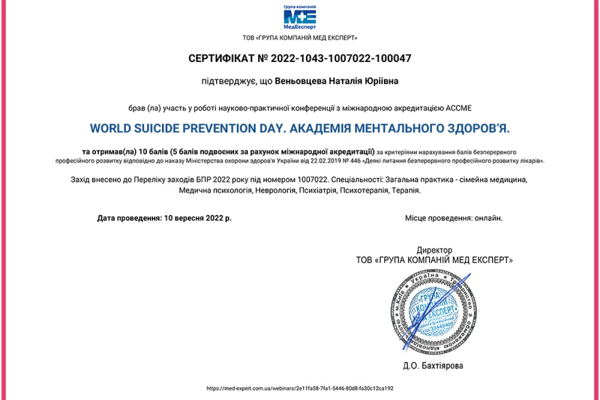 - 2022: Науково-практична конференція: Suicide prevention day.