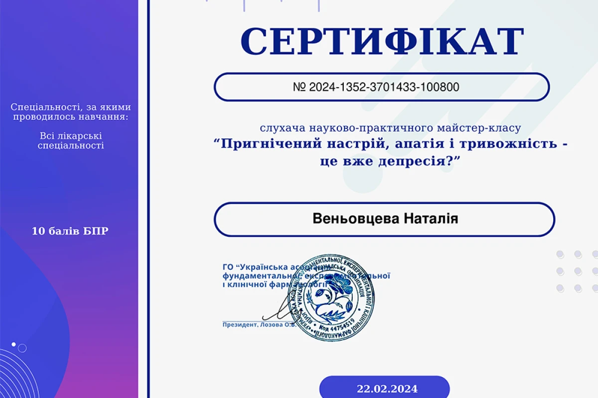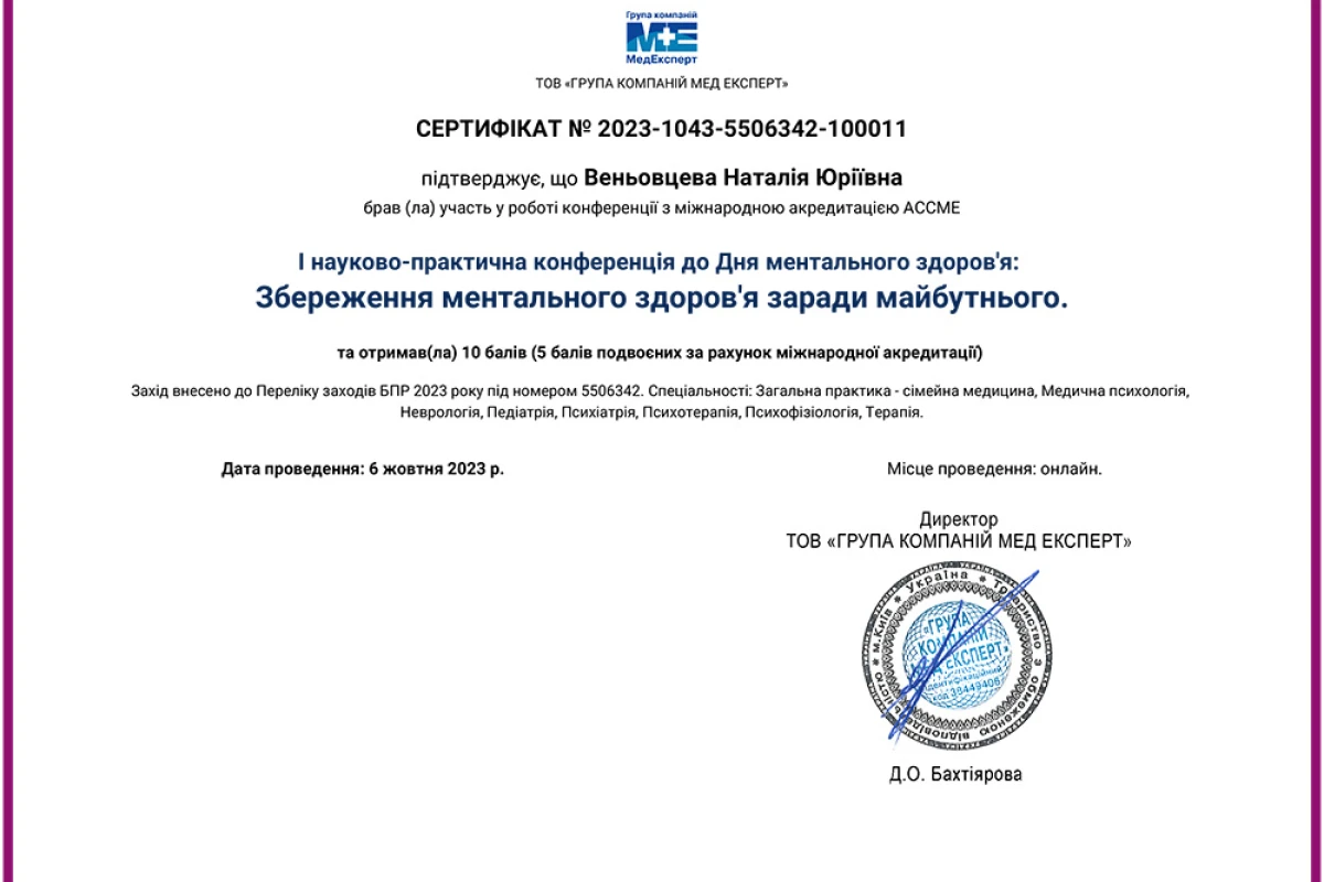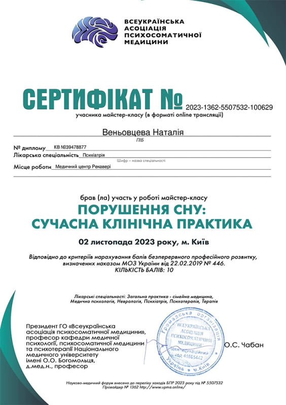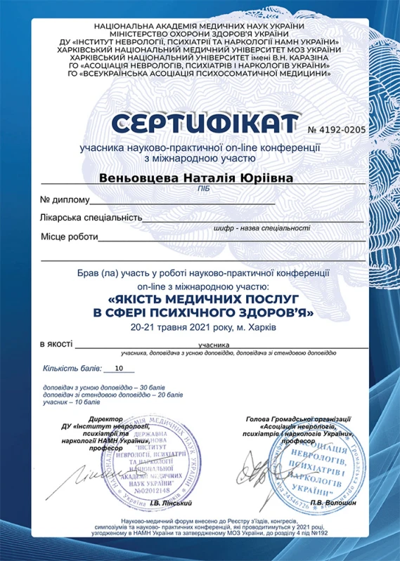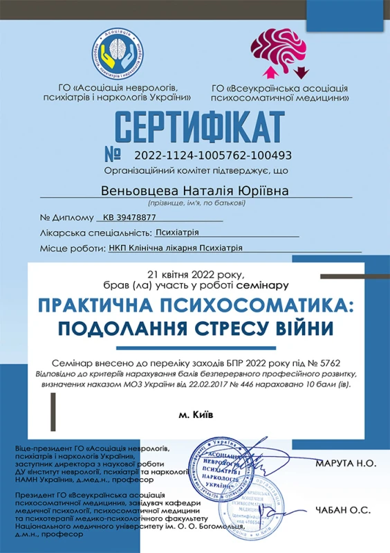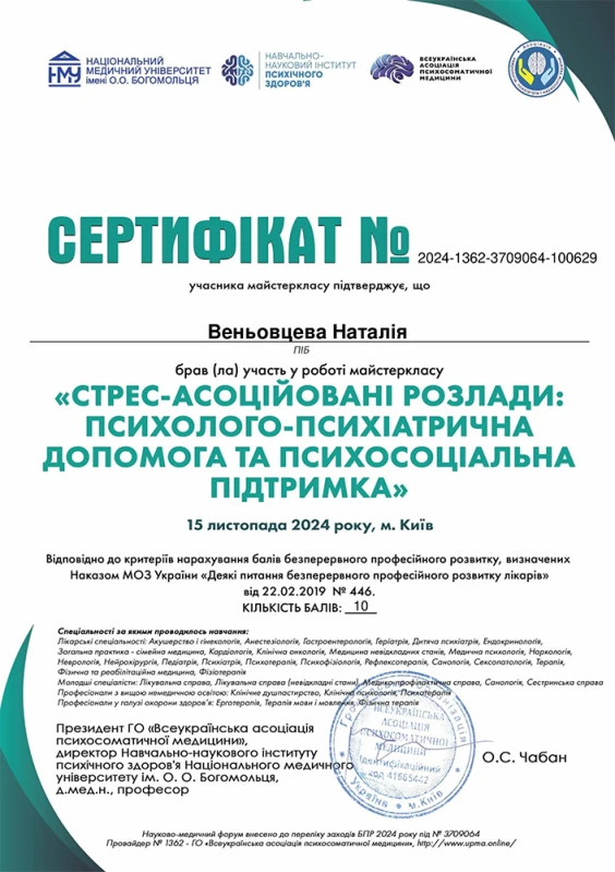 Веньовцева Наталія Юріївна - психіатр, психотерапевт, клінічний психолог