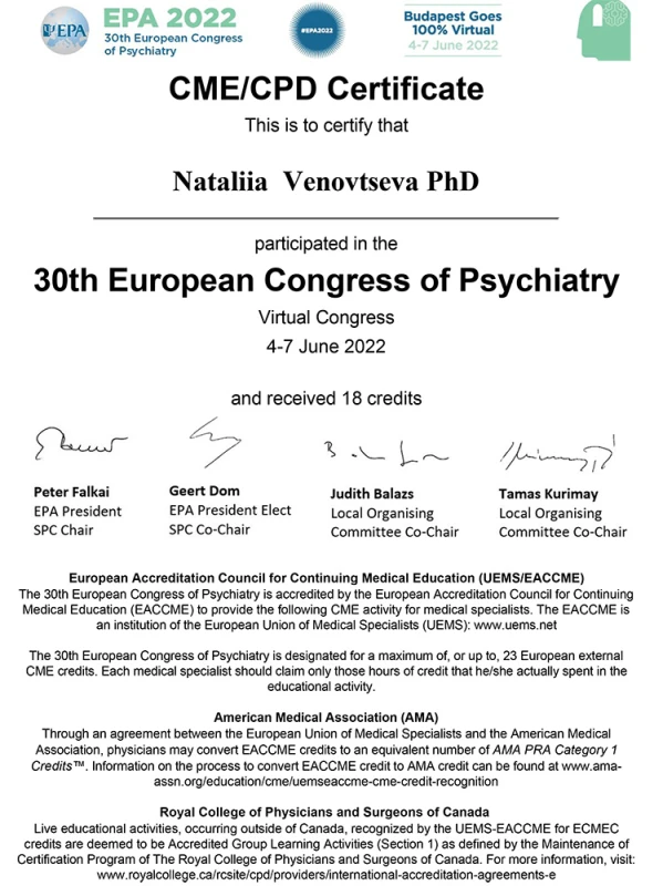 - 2022: 30th Europen Congress of Psychiatry, Budapest