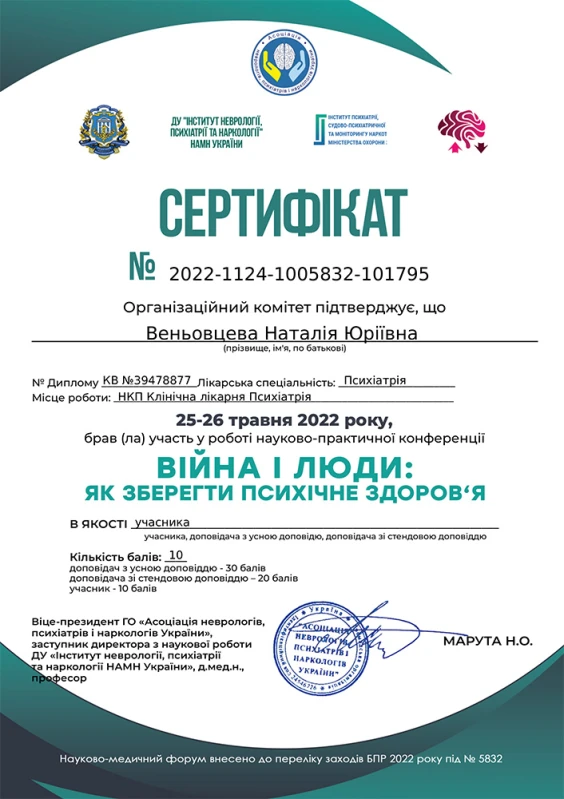 - 2022: Науково-практична конференція: Війна і люди: як зберігти психічне здоров”я