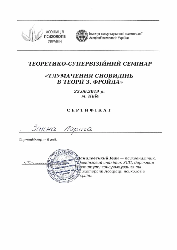 - 2019: Теоретико-супервізійний семінар «Тлумчення сновидінь в теорії З. Фройда»
